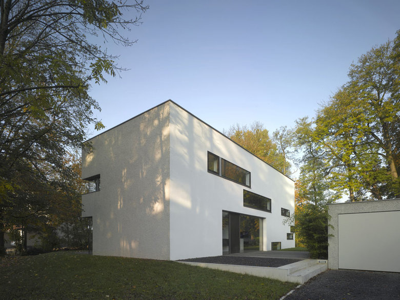 Die horizontalen Formate der Fenster verbinden die beiden Themen wieder. Im Inneren desWohnhauses steht ein installierter Kern, abgelöst von den Außenwänden. Darum herum sind die Hauptnutzungen angeordnet, ein Luftraum verbindet sie miteinander. Durch das Licht- und Schattenspiel sowie die Erlebbarkeit der Tages- und Jahreszeiten ist eine bewohnbare Raumskulptur entstanden.