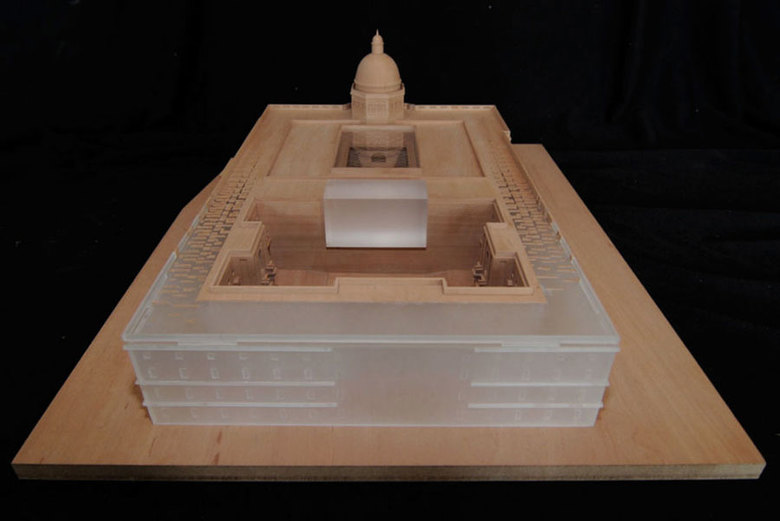 Sehnsucht, Romantik und der Wunsch nach dem Aufleben derVergangenheit, die Veranschaulichung kultureller Werte, auch wenn dies nur in Momentaufnahmen ohne Kontext gelingen wird, sehen wir als starke, nicht abstreitbare Vorgaben. So werden Westfassade mit Hauptportal und Kuppelbau wieder in altem Glanze erstrahlen, während die Längsseiten als Analogie zum geschichtlichen Prozess überführt werden in eine „moderne Ostfassade“. Vergangenheit und Gegenwart sind ambivalent.