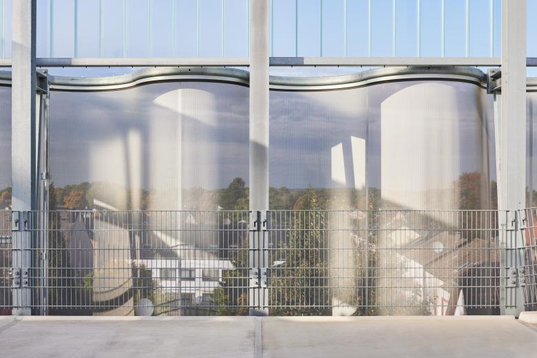 Dies wurde konstruktiv so gelöst, dass man dem Stützenraster dieses Standard-Parkhauses folgend, alle 2,5 m eine Konsole gesetzt hat, die in die Konsolenauskragung eingebettet ist und über eine Verbindung an das in Freiform gebogene Stahlrohr andockt. Um diese Last aufzunehmen, wurde dieses mit einer Wandungsstärke von 19 mm dimensioniert, was über diese Strecke ein Gewicht von mehreren Tonnen bedeutet. Trotzdem sieht die Rohrdimensionierung auf die Gesamtkonstruktion betrachtet mit einem Durchmesser von 120 mm immer noch sehr filigran und zurückhaltend aus. In das Stahlrohr ist das Aluminiumschienen-Kedersystem eingebettet, das die Membran aufnimmt und jeweils in der gleichen Form gebogen ist wie das Stahlrohr, sodass der Anschluss einwandfrei funktioniert. Dazwischen wird über eine Strecke von 11 m die Membran mit einem angeschweißten Keder verspannt. Generell ist die eingesetzte Fassadenmembran sehr resistent gegen sämtliche Witterungseinflüsse wie Wind, Hagel und auch UV-Strahlung. Seit der Erstmontage sind Membran und Spannkonstruktion auch richtig sturmerprobt und hielten einem Starksturm mit Windgeschwindigkeiten bis zu 140 km/h ohne Probleme stand.
