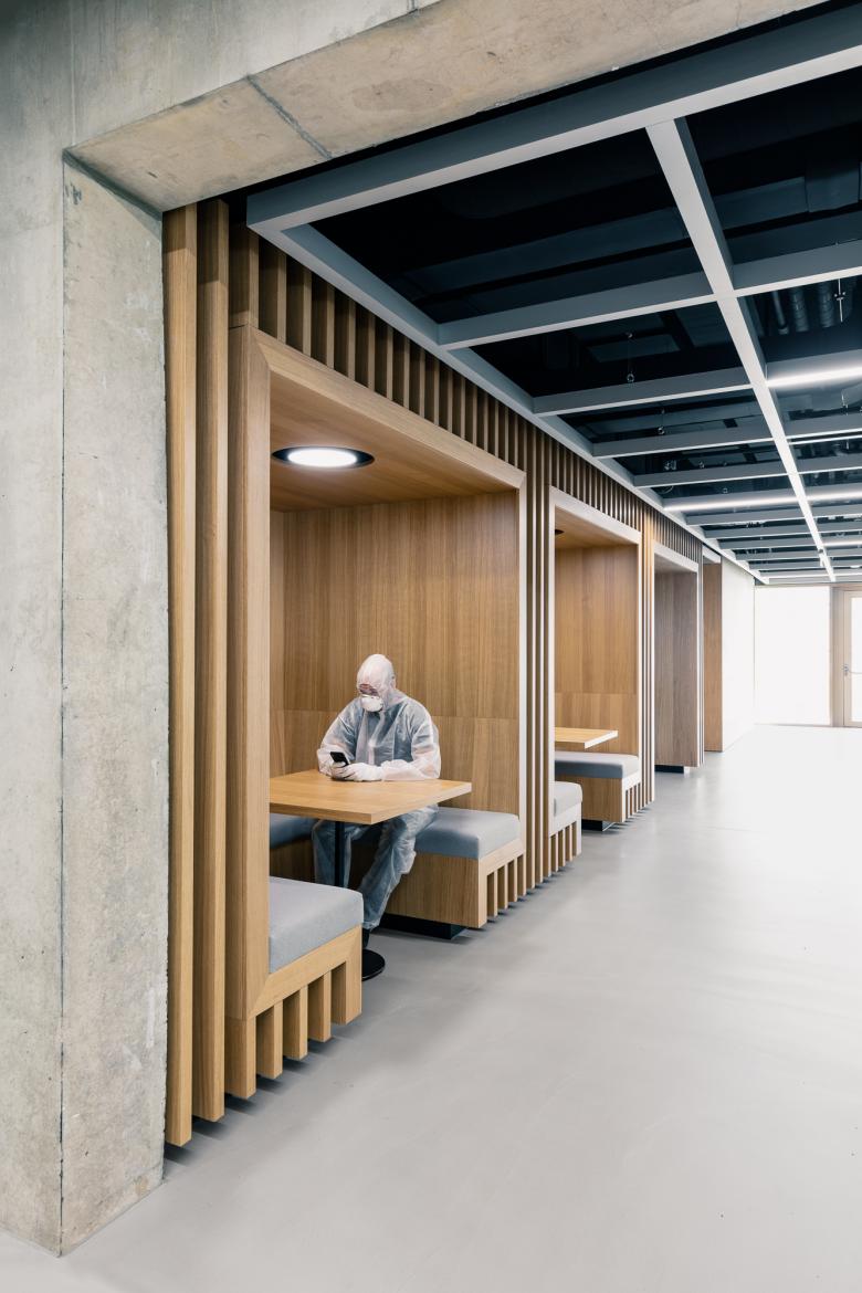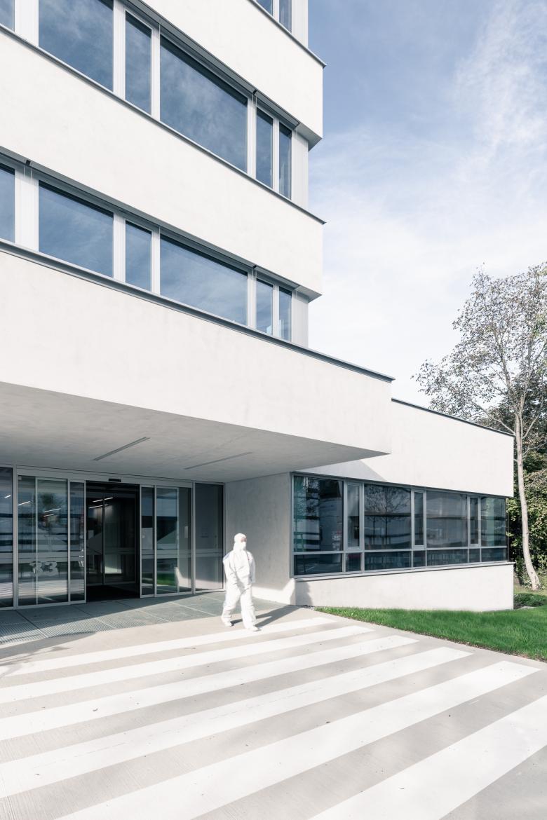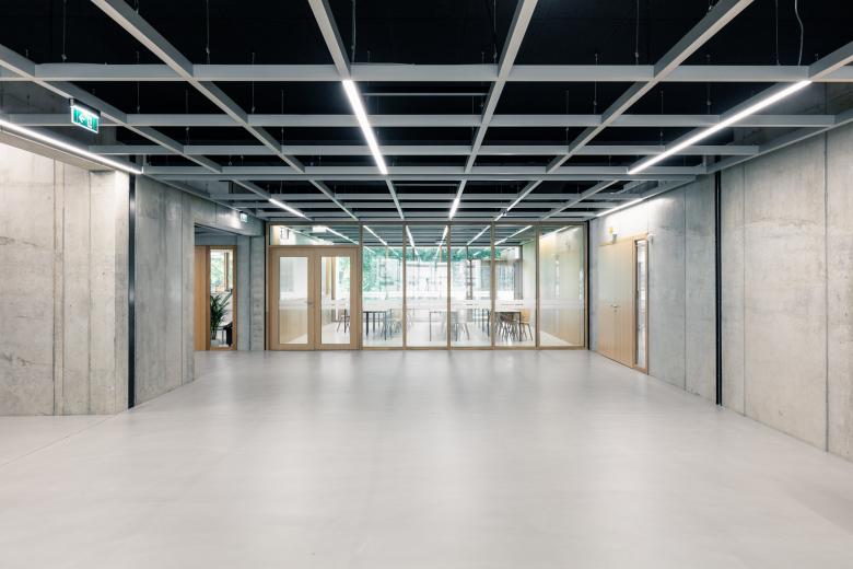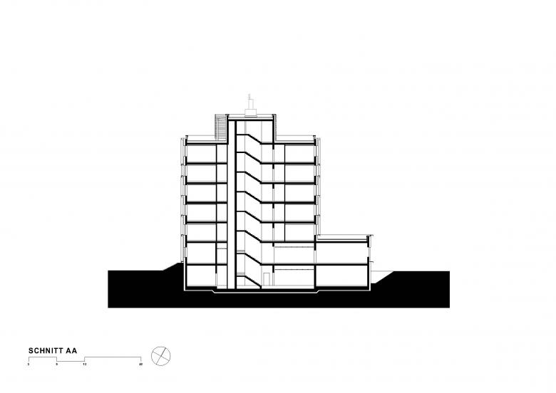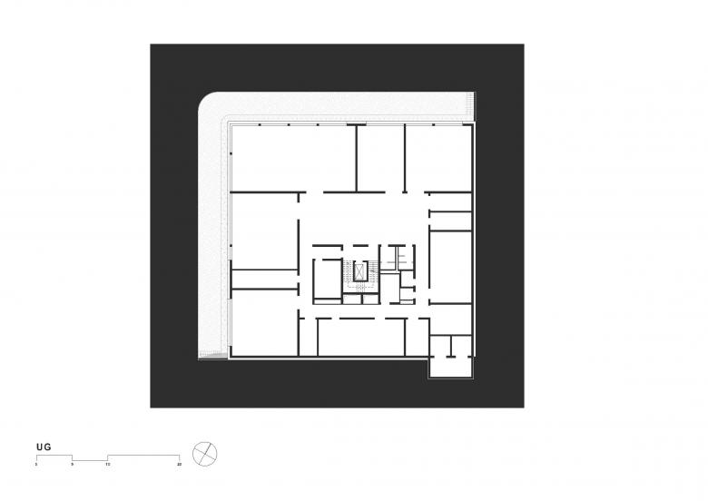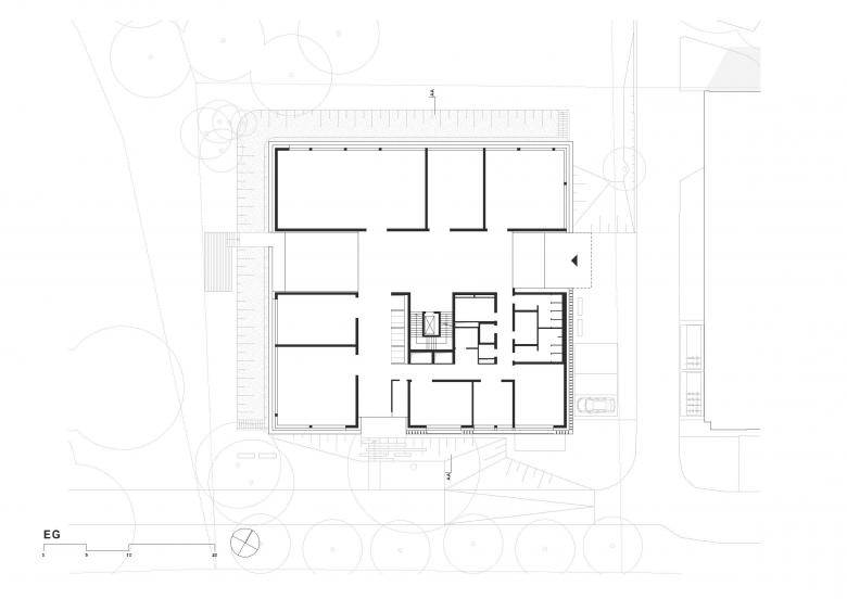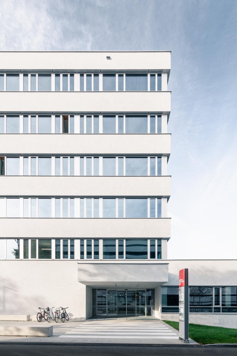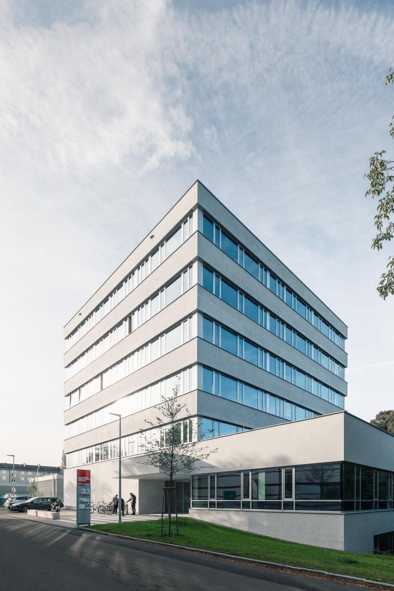 Der Neubau des EBS Centers auf dem Areal der Inffeldgründe der Technischen Universität Graz markiert eine Art Anfangs- und Endpunkt. Als figuratives Satzzeichen wurde der Baukörper deshalb auch zu einem Solitär ausformuliert. Die markante sechsgeschoßige Ostseite des EBS Centers bildet die urbane Front Richtung Campus. Die Abstufung mit Übergang zum Sockel schafft eine sanfte Verbindung zum angrenzenden Grünraumund zur kleinteiligen Nachbarschaft. Der Baukörper gliedert sich in Labor- und Forschungsräumlichkeiten und ein darüber situiertes Punkthaus mit Büronutzung. Sein kompakter, innenliegender Kern mit Stiegenhaus und angrenzenden Nebenräumen gewährleistet kurze Wege. Informelle Besprechungskojen bieten Rückzugsorte und werten den Erschließungsbereich zusätzlich auf. Während sich die Büroräume in den Obergeschoßen U-förmig um den Gebäudekern fügen, verstehen sich die Kommunikationstrakte als Erweiterung der innenliegenden Erschließungsbereiche und orientieren sich ebenfalls zum Grünraum hin. Mit dem EBS Center beschreitet AllesWirdGut überdies neue Wege in der Planung. Denn erstmals wurde ein Projekt von Beginn an unter Einbindung aller Fachplanerinnen und Fachplaner als Open-BIM-Projekt entwickelt. Auf diese Weise kann bereits in einer Frühphase auf einen außerordentlich detaillierten Plan zurückgegriffen werden. Punkt. Rufzeichen!