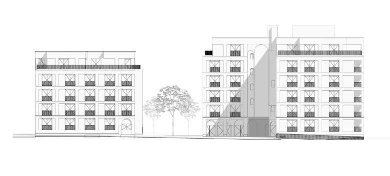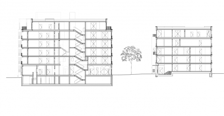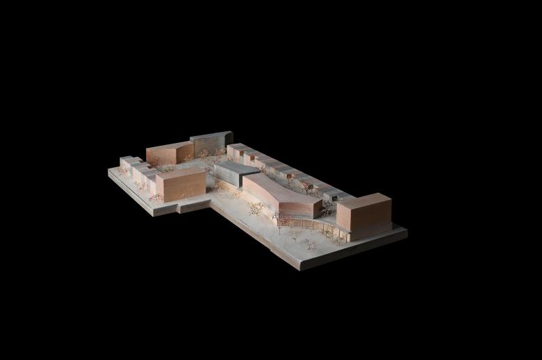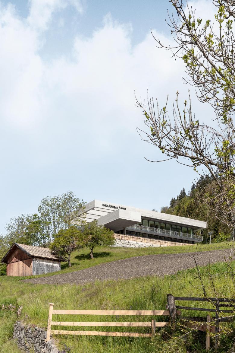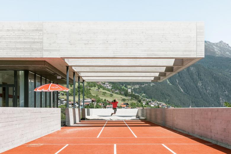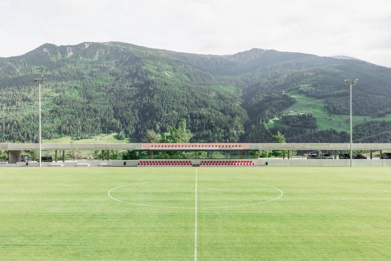 20 years after their village center project, AllesWirdGut now completed another gem of communal architecture in the village of Fließ in Tyrol. Within walking distance from the school and the village center, a mountain arena was built for the local soccer club, which includes a tournament and a training pitch, a grandstand, swimming pool, track-and-field, tennis, and trend sports facilities as well as an identity-establishing landmark clubhouse. The topography and the shape of the site called for sensitive interventions and a sparing use of existing developable areas. Suspended horizontal planes — the leitmotif of the design — were placed on and above and off the edges of the mountain flank. Suspended floor slabs also inform the appearance of the clubhouse. With its distinctive layering of constructive elevations, the eye-catcher of the sports center sits on the terraced alpine slope, while the basement and ground floors are firmly embedded in the topography. The ground floor level accommodates locker rooms, premises for trainers and referees, showers and restrooms. Covered outdoor stairs take visitors from the main entrance at pitch level to the upper floor: the pavilion-like built volume is home to the club restaurant with a bar and dining area: It has full-height glazing and an all-around balconied terrace, which not only overlooks what is happening on the pitch — the exposed outdoor areas also offer a breath-taking 360-degree panorama view.