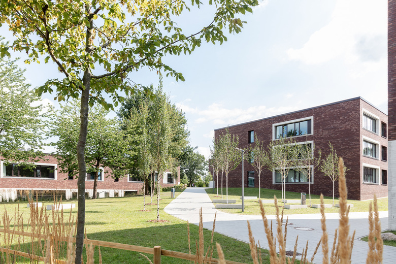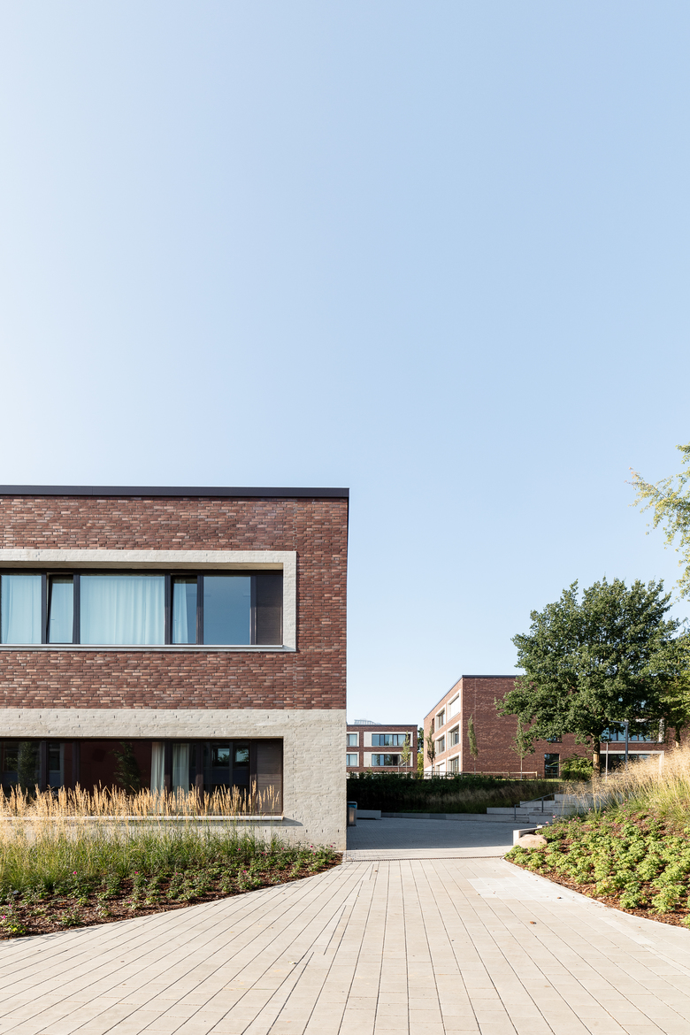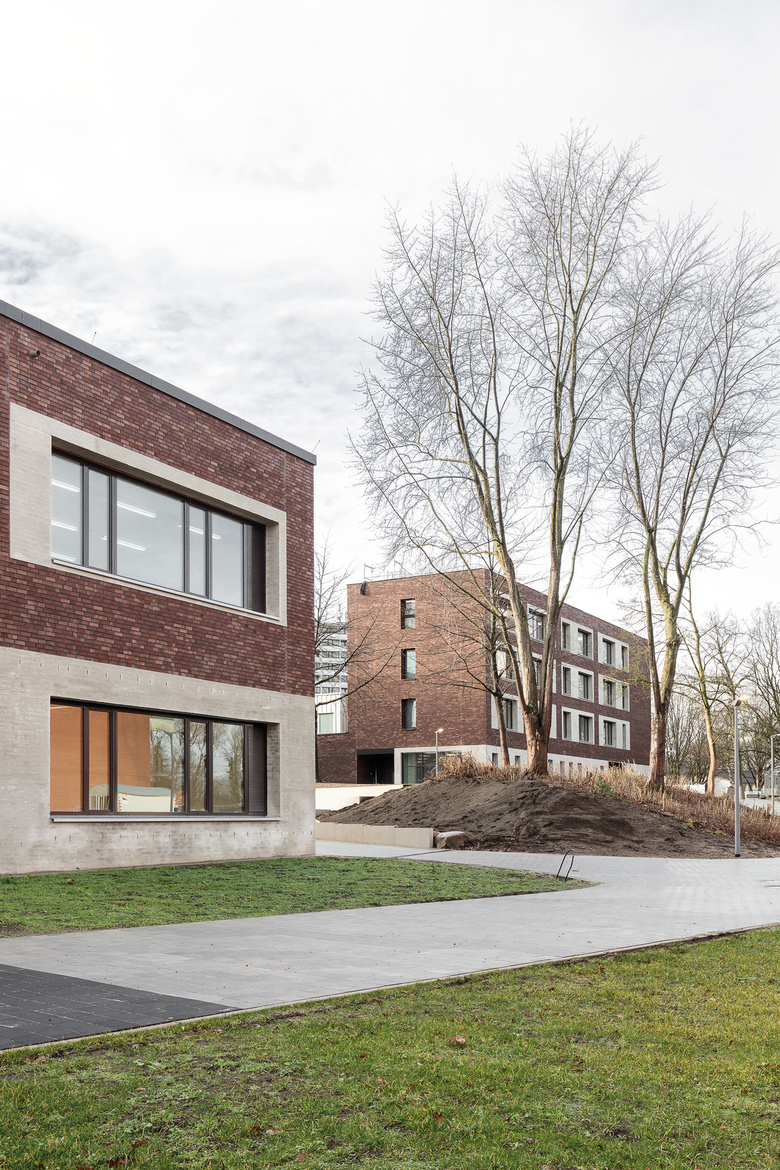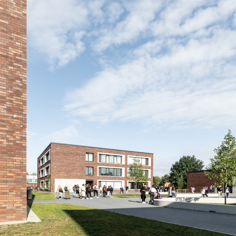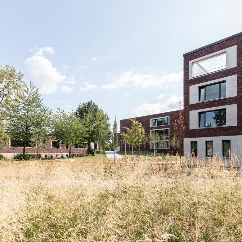 Zwei Schulen, eine Typologie, unendliche Möglichkeiten. Für die Lessing-Stadtteilschule und das Alexander-von-Humboldt-Gymnasium konzipierten AllesWirdGut und DnD Landschaftsplanung eine weitläufige Parklandschaft mit freistehenden, wohlproportionierten Solitärgebäuden. Die zueinander versetzten Bauten sind in ihrer Höhe dezent gestaffelt und fügen sich so der Dynamik des markanten Geländesprungs. Das gemeinsam genutzte Mehrzweckgebäude – Schnittstelle und Zentrum des Campus – liegt auf direkter Blickachse mit den beiden Haupteingängen und bildet einen allseits sichtbaren städtebaulichen Bezugspunkt. Allesamt sind die kompakten Einheiten von geradliniger Struktur und vermitteln eine zeitgemäße Architektursprache, die sich etwa über die einheitlich mit Klinker verkleideten Fassaden artikuliert. Im Inneren der Unterrichtsgebäude zirkulieren die Klassenräume wie die Flügel eines Windrades um ein zentrales Atrium. Offene Bereiche und Nischen bieten Möglichkeit für eine Vielzahl an Unterrichts- und Lernformen. Die Außenräume mit Biotop, Freilufttheater und Anbauversuchsflächen bieten überdies individuelle und gemeinschaftliche Bereiche für alle. Ein homogener und zukunftsgewandter Campus, der sich nahtlos in das Bestandsensemble einfügt und Freiräume für individuelle Entwicklung schafft.