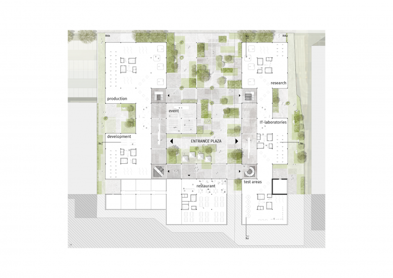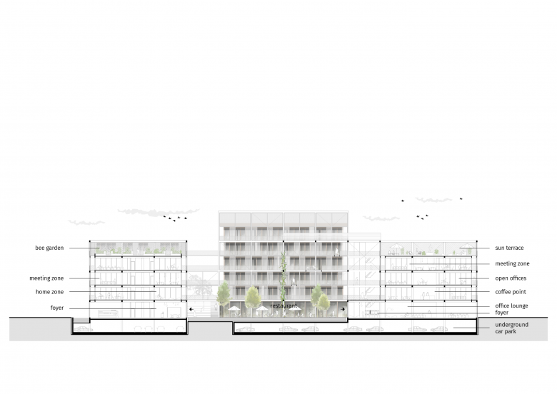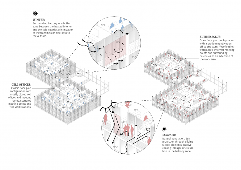 Zwischen den oberen Ebenen schaffen wechselvolle berankte Laubengänge (Gartenhäuser) Übergangsbereiche mit ökologischem Mehrwert. Einfache Glasdächer mit Photovoltaikelementen schützen hier vor Witterung und genieren Energie, die direkt genutzt, gespeichert oder in das öffentliche Stromnetz eingespeist werden kann. Durch einfache und natürliche Lüftungs- und Klimatisierungssysteme sowie durch die optimierte Gebäudehülle entsteht ein urbanes Habitat, das Mensch, Tier und Gebäude mehr Energie spendet als nimmt – zum Arbeiten, zum Leben.