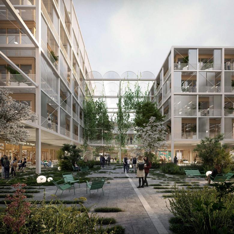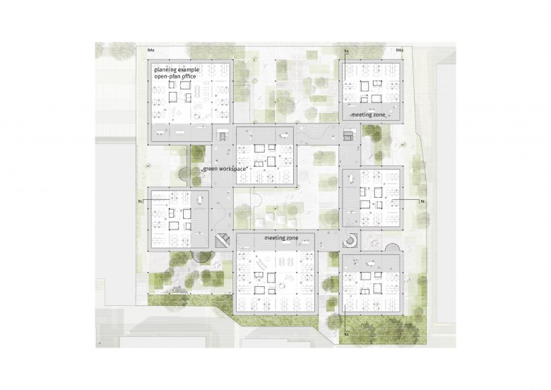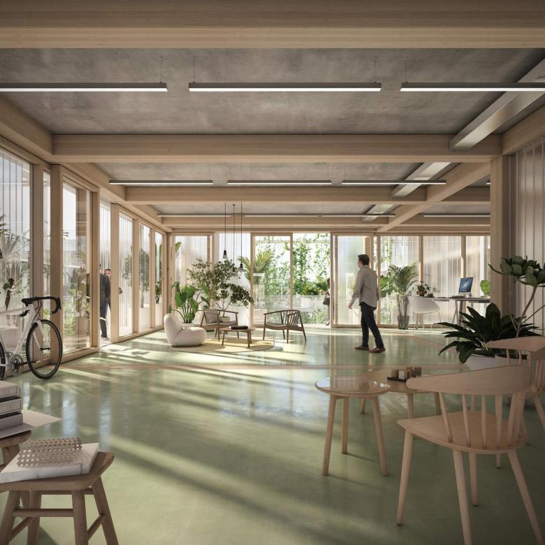 Die Hauptstruktur der sieben Bauteile besteht aus Holz, die speicherwirksamen Fertigteildecken und die unterirdische Konstruktion werden aus emissionsärmerem Beton mit Hochofenzement gefertigt. Gemeinsam mit der modularen Bauweise – einzelne Materialien können zünftig einfach ausgebaut und wiederverwendet werden – tragen die flexibel nutz- und jederzeit adaptierbaren Mieteinheiten zur Langlebigkeit der neuen Arbeitswelt bei.