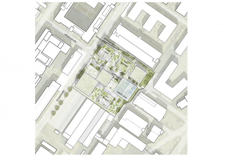 Der Entwurf für das Büroensemble Kruppstraße in Stuttgart greift das Zukunftsversprechen von flexiblem Arbeiten auf und bestückt sein offenes Büroregal mit einem Angebot vielseitiger grüner Räume: Erweiterte Arbeitsbereiche auf Balkon, Terrasse oder im Gartenhaus schaffen nicht nur einen perfekten Rahmen für gemeinschaftliches Tun, auch zum lokalen Klima und zur Biodiversität leistet der Bürokomplex einen wertvollen Beitrag. Leitgedanken wie ressourcenschonende Errichtung, klimafreundlicher Betrieb und vorausschauende Lebenszyklusplanung formen das Rückgrat eines Entwurfes mit Haltung.