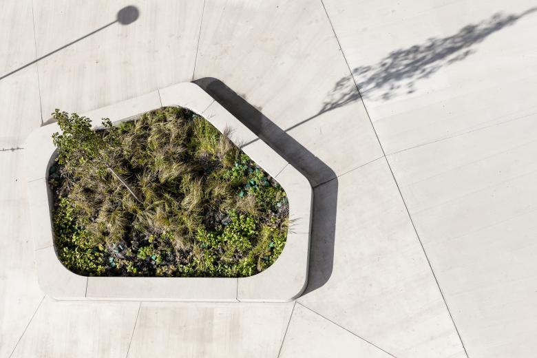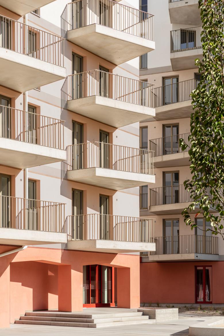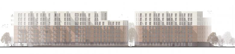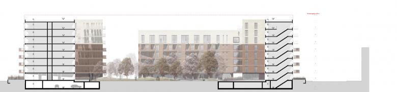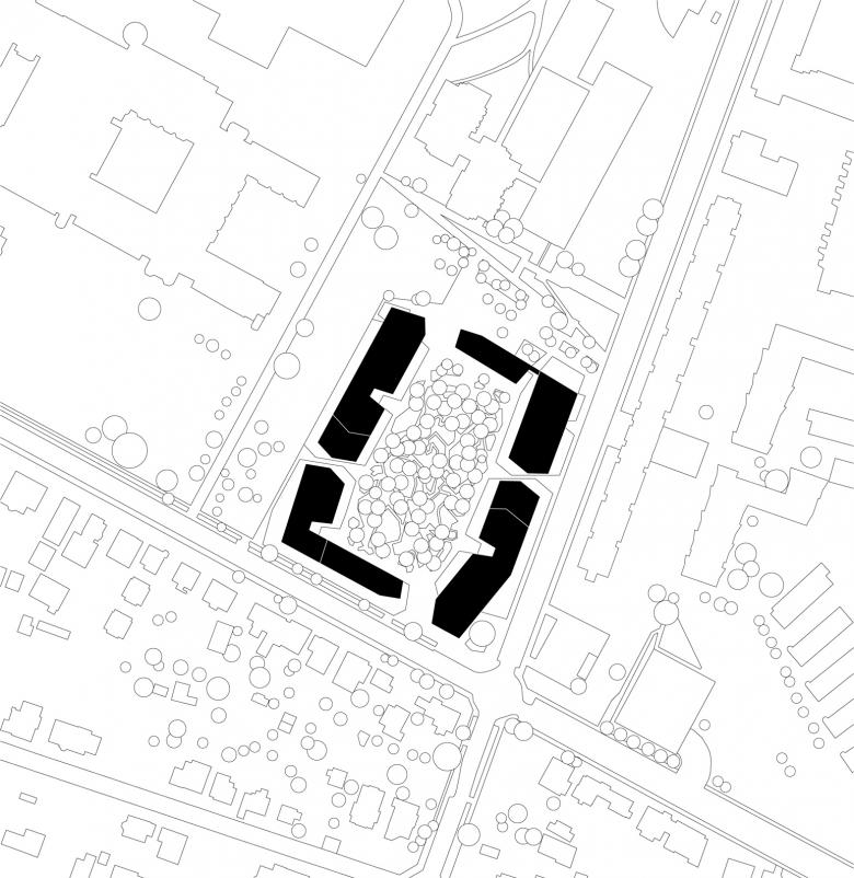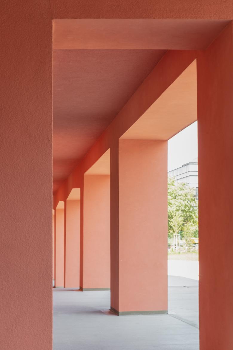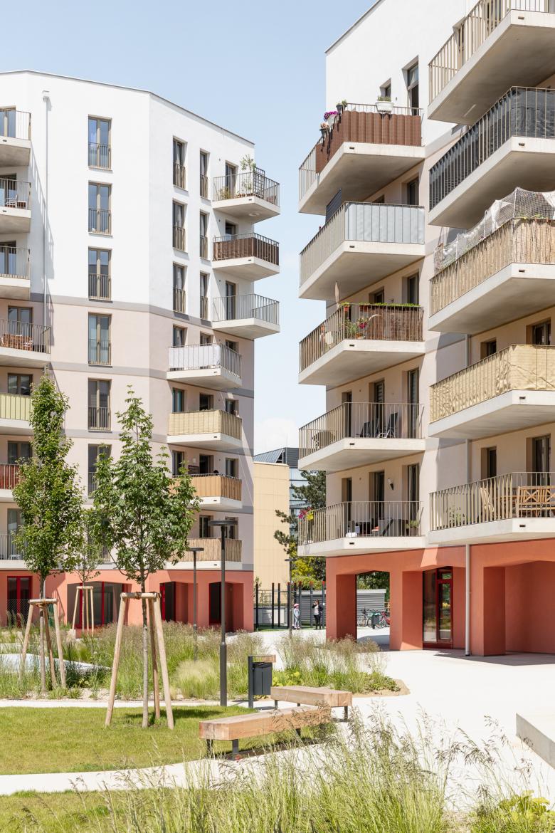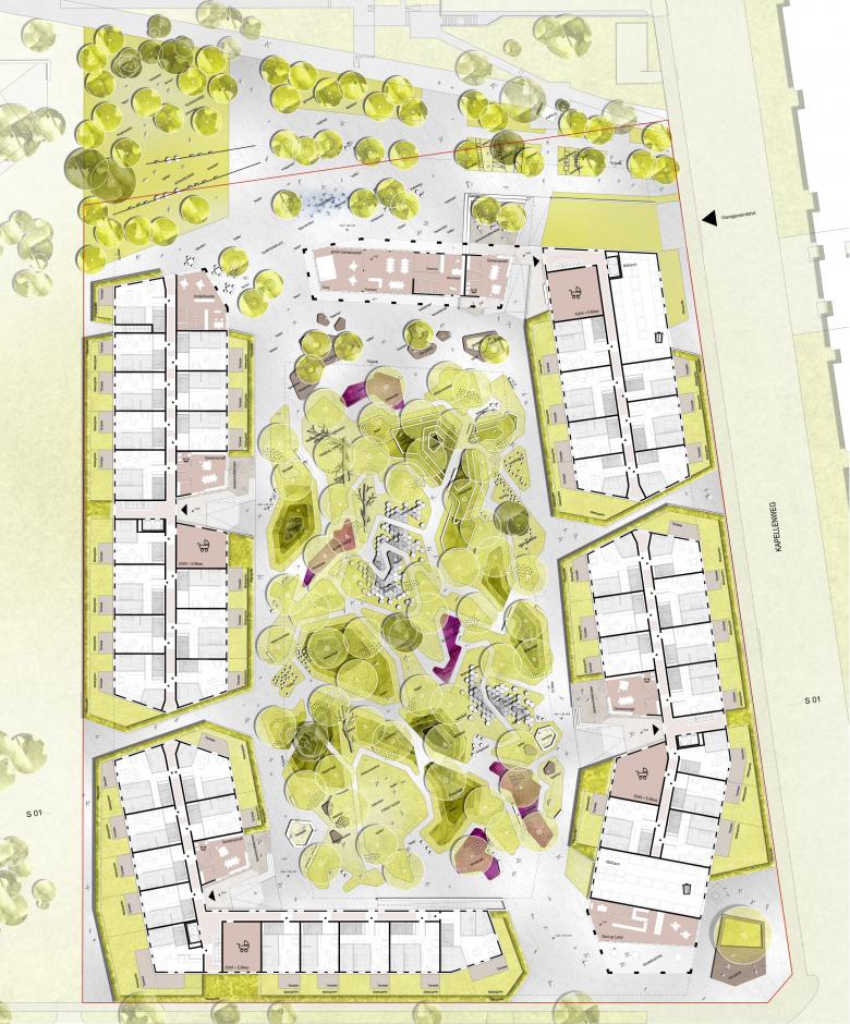 Rund um eine weitläufige Grünfläche formiert sich am Kapellenweg im 22. Wiener Gemeindebezirk ein lebendiges Wohnquartier, das sich konzeptionell und formalästhetisch am traditionellen Gemeindebau anlehnt. Als großer gemeinschaftlicher Hof erdacht, erwächst so ein klares und selbstbewusstes Ensemble: der Kapellenhof. Hier entstanden 450 neue Wohnungen aus der Feder von AllesWirdGut und feld72, deren kooperative Planung besonderes Augenmerk auf die Potenziale des Standorts legt – auf Ausblick und Grünraum! Die kleinteilige Bebauung an den Außenrändern genauso wie der Innenhof – groß wie ein Fußballfeld – bieten jeder Wohnung größtmöglichen Weitblick. Der als abenteuerlicher, topografisch bewegter „Stadtwald“ mit intimen Rückzugsflächen und offenen Lichtungen konzipierte Hof wird von vier Gebäuden gesäumt, die allesamt über zugeordnete Gemeinschaftsräume mit kollektiv genutzten Terrassen verfügen. Der Park als grüner Drehund Angelpunkt unterstreicht und unterstützt das nachbarschaftliche Miteinander. Das Ansinnen, ein Grätzel der Begegnung und der Interaktion für über 1.000 neue Bewohnerinnen und Bewohner entstehen zu lassen, drückt sich überdies in einem großen Multifunktionsraum im Norden sowie in einem Lokal an der südlichen Kreuzung aus. Ein vitales Vierkantensemble, das Wald und Nachbarschaft wachsen lässt!