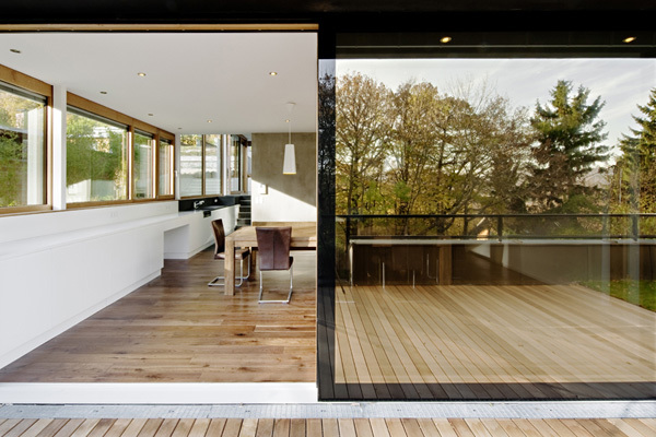 Auf jeder Ebene öffnet sich das Hausinnere auf andere Weise zur Außenwelt: Hangeinschnitt und Tiefhof belichten Eingang und Mehrzweckraum. Aus einem Keller wird vollwertiger Lebensraum. Darüber schmiegen sich die Wohnebenen direkt in den Hang des Grundstücks, vom Garten nur durch ein umlaufendes Fensterband getrennt, das in alle Richtungen Austritt und Ausblick ermöglicht.