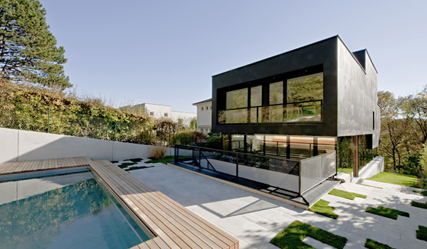 Bestärkt wird dieser Anschein durch die mattschwarze Fassade des Hauses. In seinem Inneren hingegen bietet es seinen Bewohnern mithilfe von sieben, jeweils halbgeschossig zueinander versetzten Ebenen eine weitläufige und abwechslungsreiche Wohnwelt.
