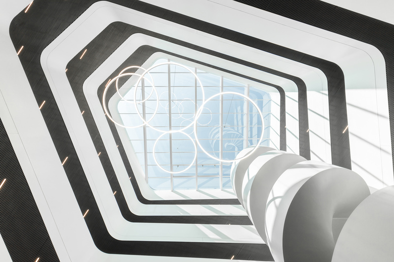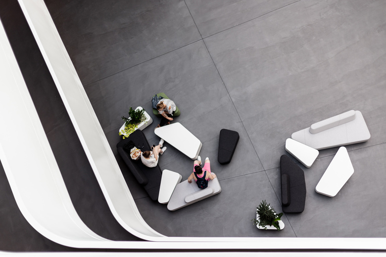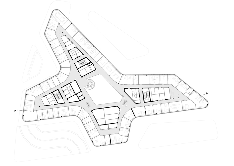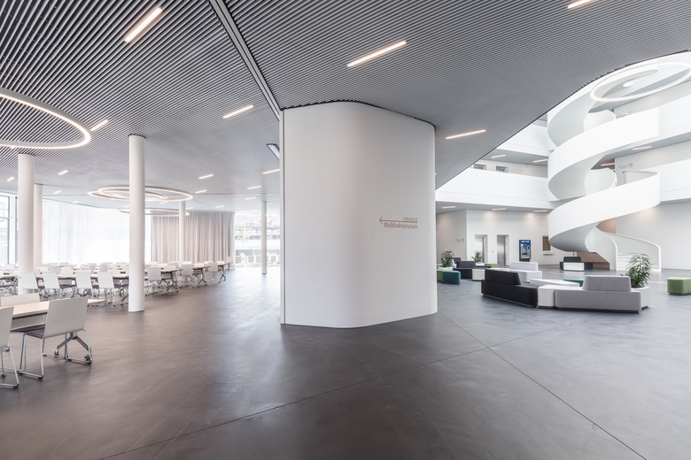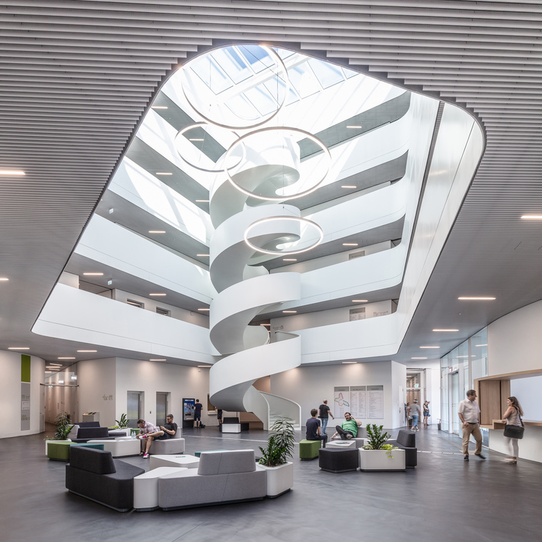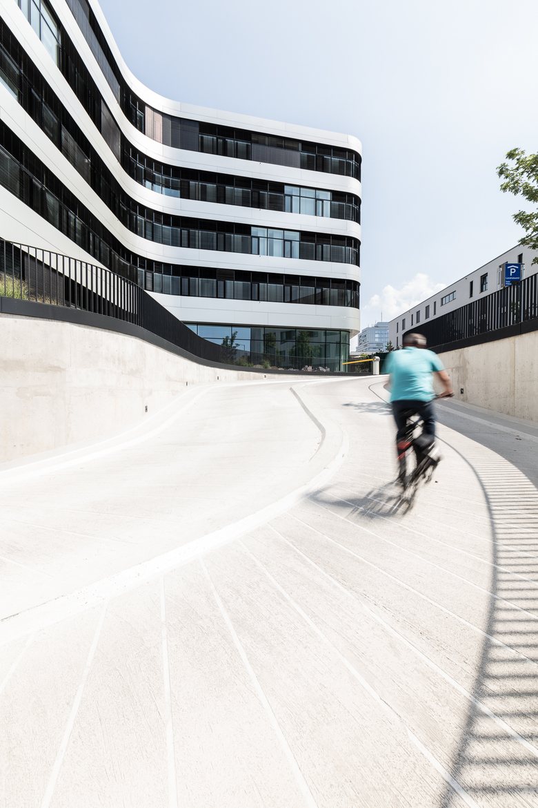 Der transparente Erdgeschoßsockel ist allseitig öffentlich zugänglich. Eine Cafeteria bietet Sitzmöglichkeiten im Innen- und Außenbereich. Über eine großzügige Freitreppe gelangt man in die oberen Stockwerke, in denen die Büroarbeitsplätze situiert sind. Die glatte Glasfassade wird um Aluminiumlamellen ergänzt. Diese schützen vor Sonneneinstrahlung und verleihen der Fassade Bewegung und Tiefe.