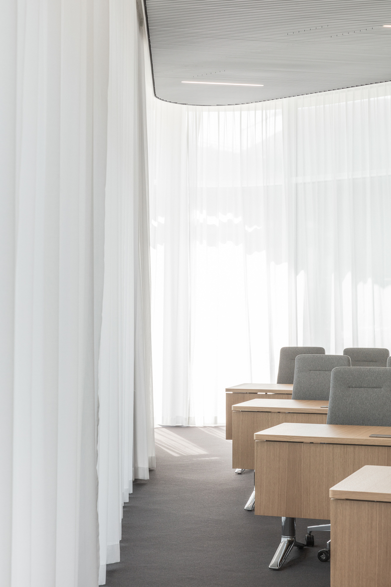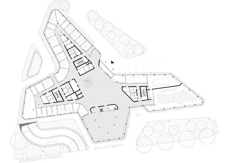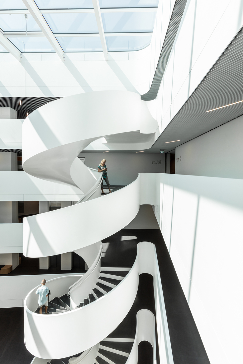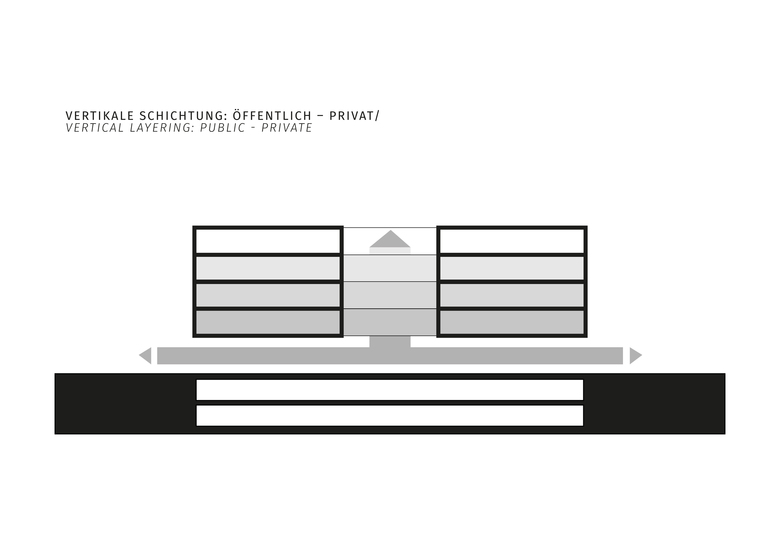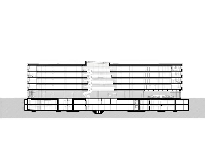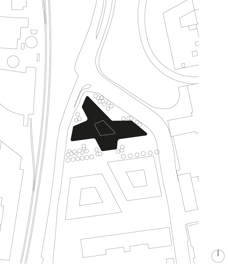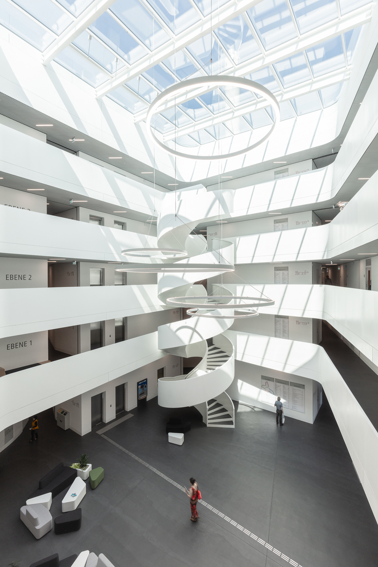 Mit dieser städtebaulichen Form wird der Grundstein für ein übersichtliches Amtsgebäude gelegt, das alle vorhandenen Publikumsströme in selbstverständlicher Weise leitet und auf kürzestem Weg zur zentralen Eingangshalle mit seinem mehrgeschossigen Atrium führt.