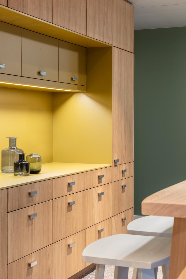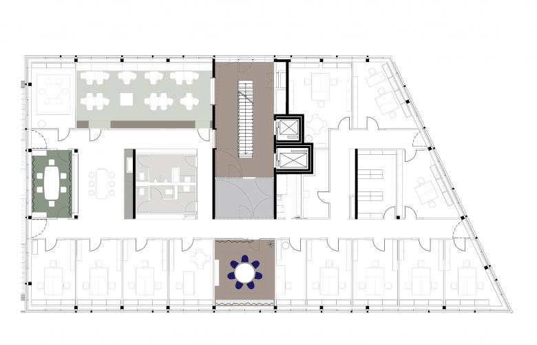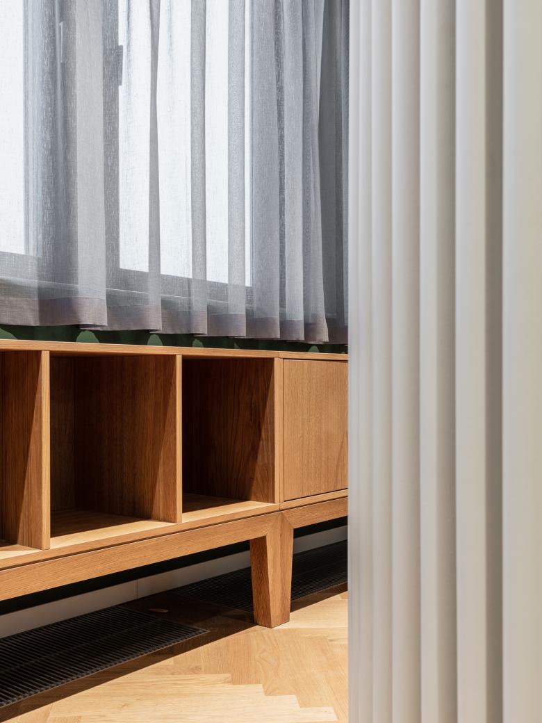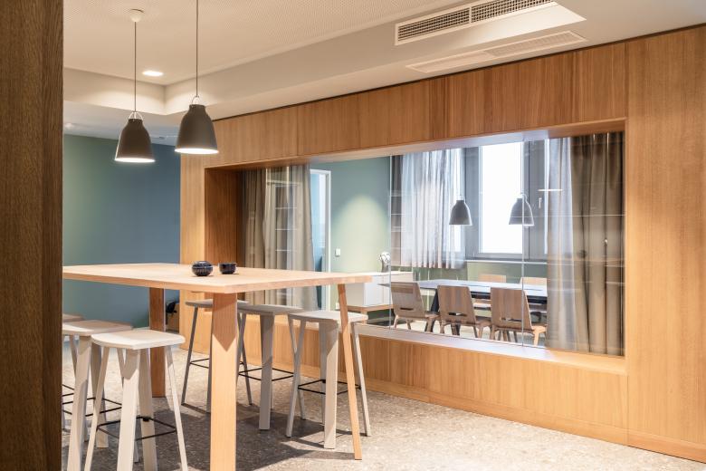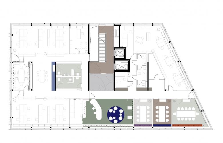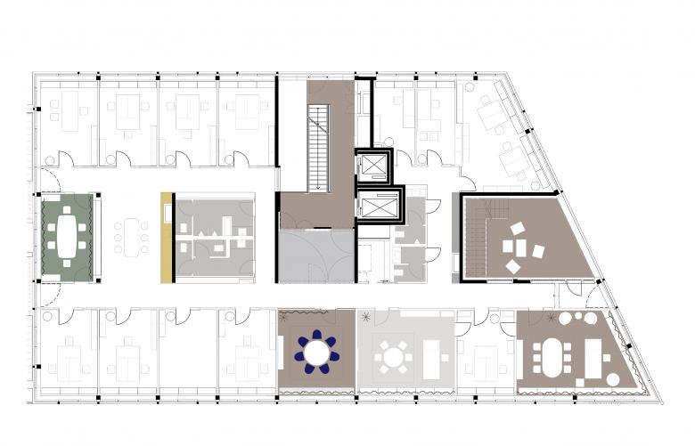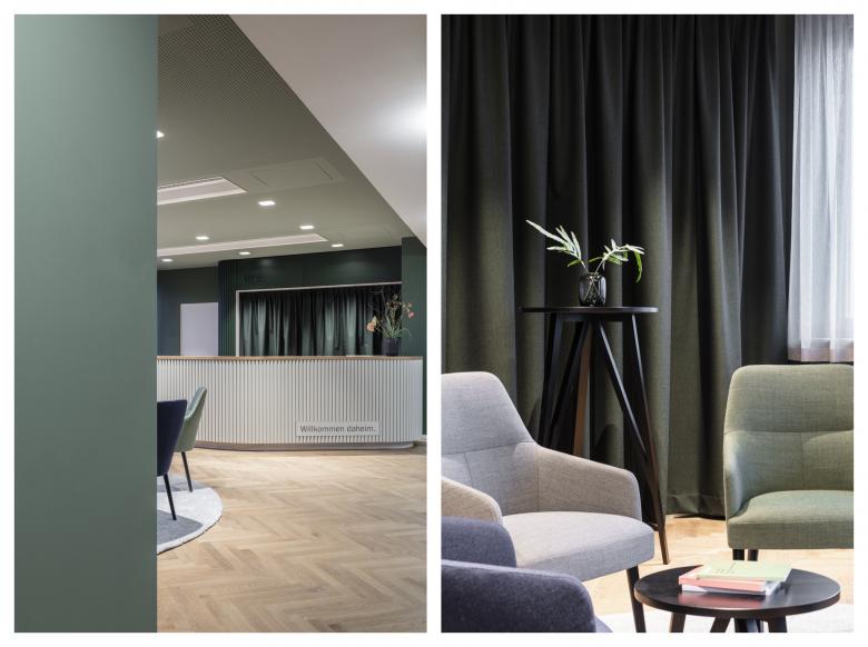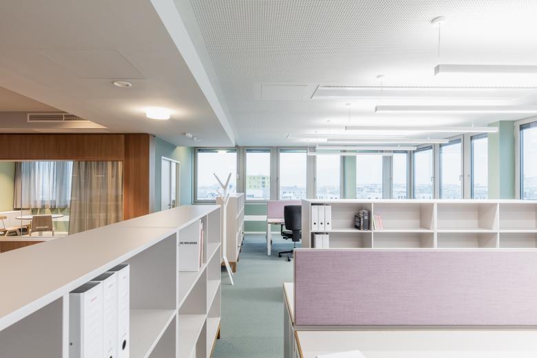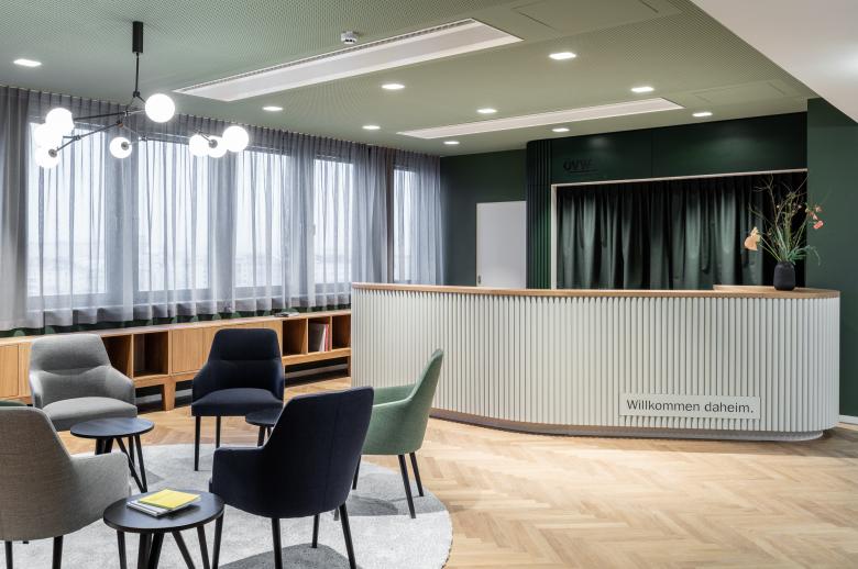 Als Wohnbauunternehmen setzt es sich das Österreichische Volkswohnungswerk seit jeher zum Ziel, Wohnen neu zu leben. Sein Leitspruch: Willkommen daheim. Willkommen beim ÖVW. Der damit einhergehende Wunsch, auch den Arbeitsalltag neu zu kontextualisieren, drückt sich nun auch in seinen Büroräumlichkeiten am Tabor aus. So gründet die Innenraumgestaltung auf der kraftvollen Kombination aus belebenden Grün- und Blautönen und spürt dem menschlichen Bedürfnis nach Ruhe, Weite und Natur nach. Klare Formen, akzentuierende Leuchtkörper, solide Bodenbeläge, pointilistisches Dekor und ein sich sanft einfügendes Holzmobiliar schaffen eine zurückhaltende und dennoch inspirierende Atmosphäre – einen Ort des betriebsamen Beisammen- und des produktiven Beisichseins.