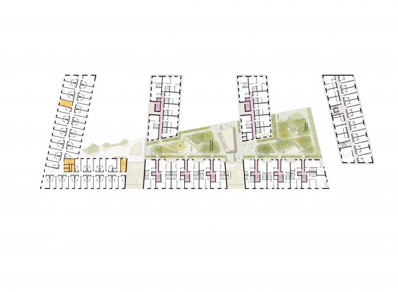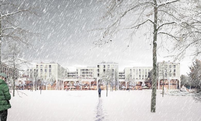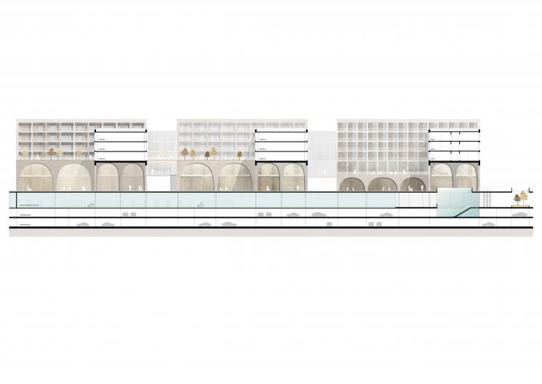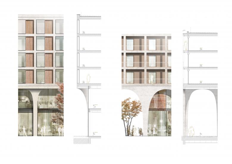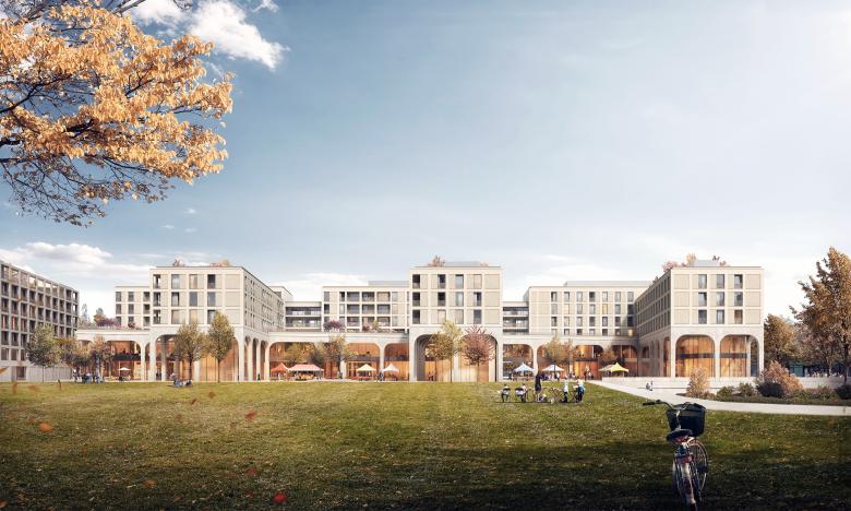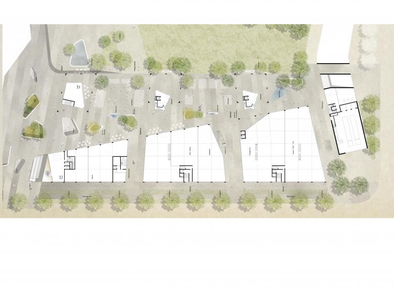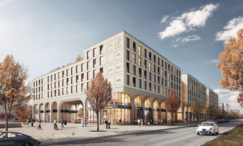 Die Perlach Plaza ist Drehkreuz, Aushängeschild und Visitenkarte. Mit ihrem urbanen Nutzungsmix aus Einzelhandel, Dienstleistung, Gastronomie, Wohnen und Hotellerie nimmt sie eine essentielle städtebauliche Funktion in der Entwicklung des neuen Zentrums KulturQuadrat am Münchner Hanns-Seidel-Platz ein. Herzstück des Masterplans ist ein etwa 5.000 Quadratmeter großer, von den umliegenden Gebäuden schützend gerahmter Park. Im Inneren des mischgenutzten Komplexes wiederum entstehen auf insgesamt 50.000 Quadratmetern hochwertige erschlossene Flächen, die das Quartier unmittelbar an die U-Bahn, ein Kulturzentrum sowie an die großzügigen Freiflächen anbinden. Gestalterische Elemente wie sanfte Rundbögen und einladende Arkaden verschalten die Perlach Plaza atmosphärisch mit dem Markt, den Gassen und Passagen der Münchner Innenstadt. Dieserart entsteht ein lokalauthentisches Quartier mit identitätsstiftender Dimension. Flaneurinnen und Flaneure erkennen in der dreigeschoßigen Sockelzone ein lebendiges, hochwertiges und zusammenhängendes Ensemble – einen Umschlagplatz mit grünem Herz und Münchner Seele.