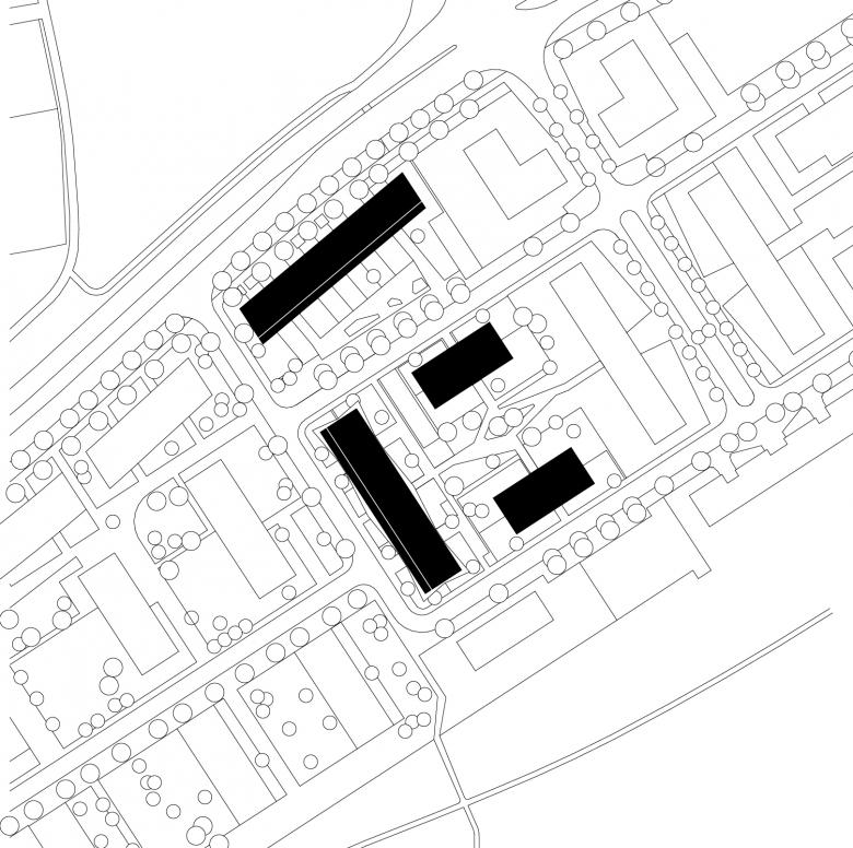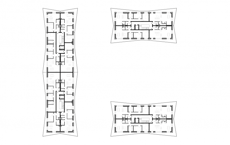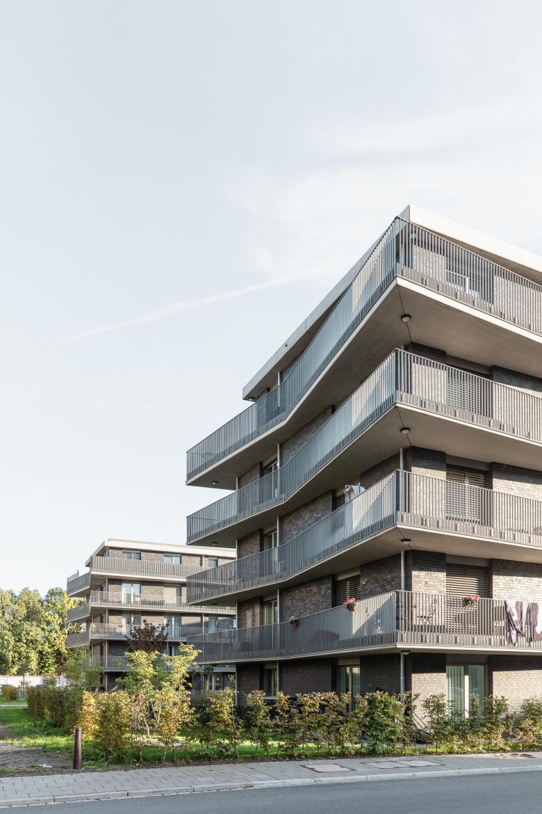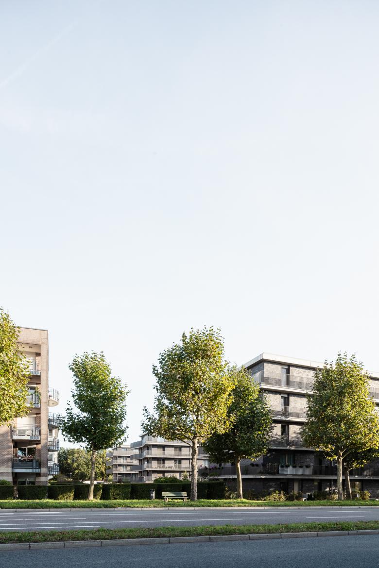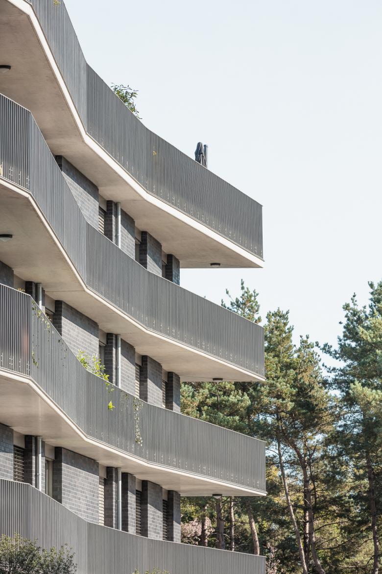 Vater, Mutter, Kind. Wie eine prototypische Familie fügen sich im Luxemburgischen Kirchberg zwei große und zwei kleine Baukörper zu einem neuen Ensemble, das insgesamt 94 Wohnungen Platz bietet. Die langgestreckten Baukörper im Quartier du Parc Réimerwee liegen am nordöstlichen Rand eines Neubaugebietes, die nordwestliche Seite wird vom Boulevard Konrad Adenauer gesäumt. Nach Süden hin öffnet sich die Anlage zum Parc Réimerwee. Zwei punktförmige Bauten vervollständigen das Ensemble und lassen so ein aus vier Individuen zusammengesetztes architektonisches Kollektiv entstehen. Die Differenzierung der Baukörper verhilft dem Gesamtkomplex im Quartier du Parc Réimerwee – wie in einer aus unterschiedlichen Charakteren bestehenden Familie – zu einer heterogenen, vielfältigen Erscheinung. Im straßenseitigen Riegel sind sämtliche Wohnungen zum Park hin orientiert und verfügen allesamt über einen Balkon oder eine Terrasse. In den parkseitigen Häusern sind die Apartments zu allen Seiten geöffnet, somit entstehen Wohneinheiten höchst unterschiedlichen Zuschnitts. Das verbindende Treppenhaus weitet sich zu einem Gemeinschaftsraum mit Terrasse. Die Fassaden der Gebäudeteile sind horizontal gegliedert, wobei sich das Band auf Höhe der Wohnräume zu geräumigen Balkonen verbreitert. Umlaufende Geländer verstärken die dynamische Wirkung der in den harmonischen Familienverband eingebetteten Baukörper.