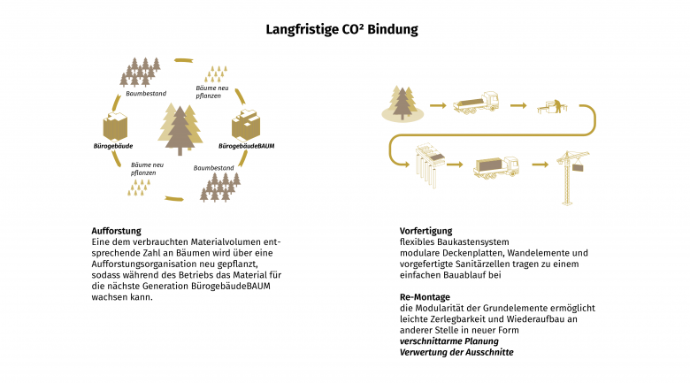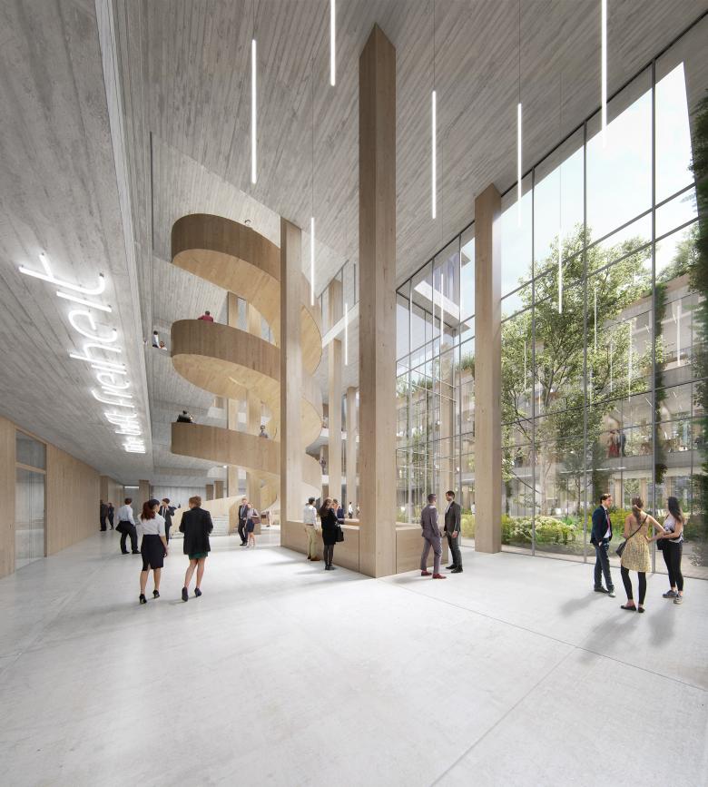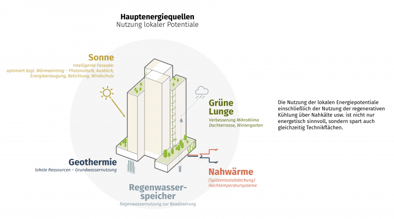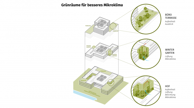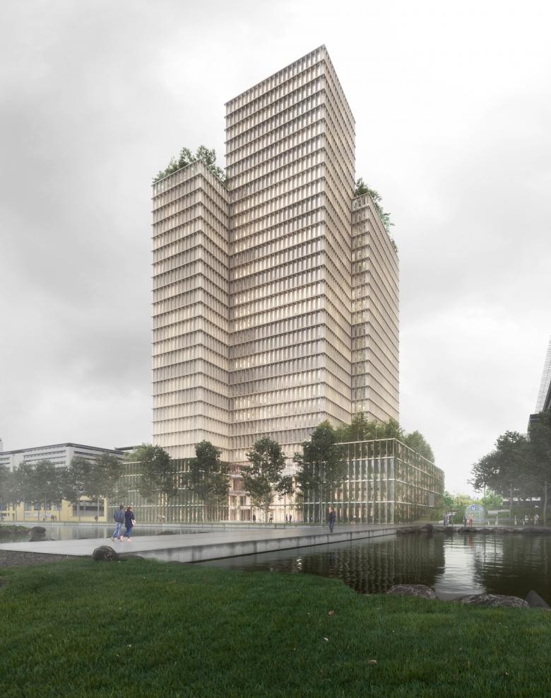 Oberhalb des Sockels befinden sich ein Konferenzzentrum, die technischen Abteilungen sowie die (eigens erschlossene) Verkehrs- und Tunnelleitzentrale. Als Verpflegungs- und Erholungsbereiche verbinden die darüberliegenden Geschoße – eine Cafeteria mit großer Terrasse und eine Work-Life-Balance-Ebene – die öffentlichen Zonen mit den Büroetagen. Diese strukturieren sich in jeweils zwei flexibel nutzbare Büroeinheiten (Business Clubs), die um dreigeschoßige Wintergärten und Meetingräume kreisen. Das Klima- und Energiekonzept des Gebäudes sieht die Nutzung lokaler Potenziale aus regenerativen Quellen mittels Photovoltaikanlagen, Regenwasserspeicher, Betonkernaktivierung, Geothermie sowie ergänzender Nahwärme und -kälte vor. Ebenfalls im Sinne der angestrebten positiven Gebäudebilanz werden sämtliche Ebenen des Turms als Holz-Beton-Tragwerk ausgestaltet. Auch die Hybridbauweise der Decken stellt durch einen