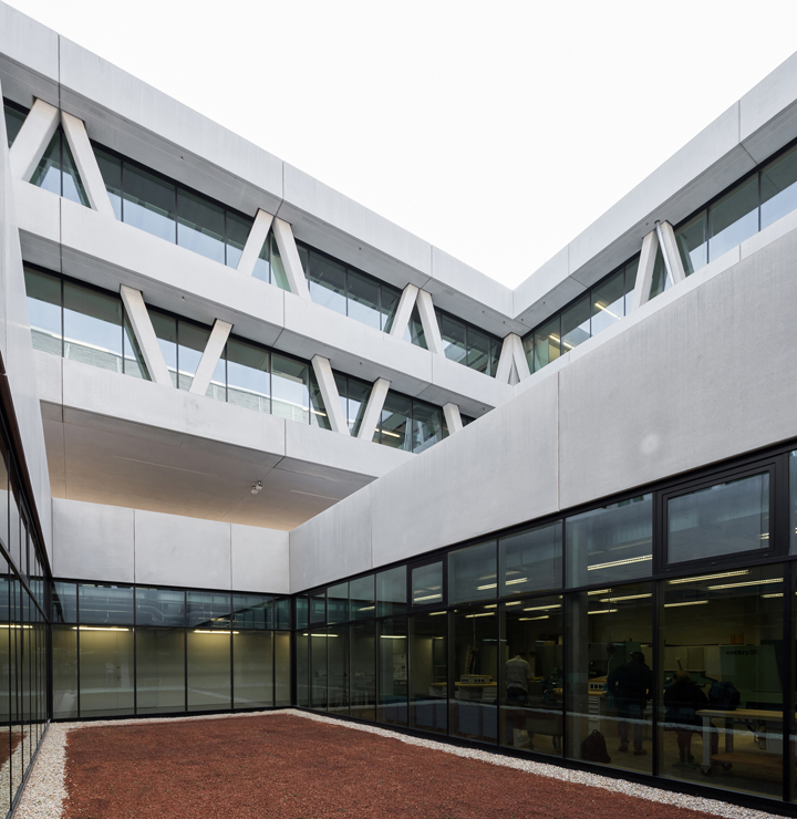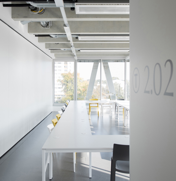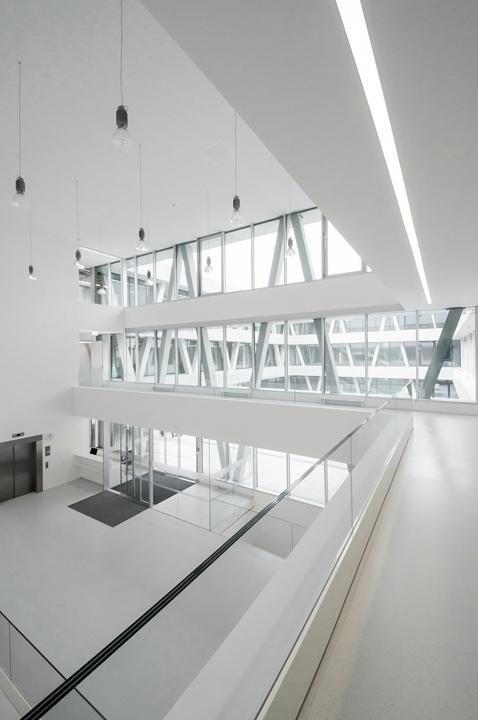 Ein gemeinsames Foyer verbindet alle Nutzungen, alle Geschosse und alle öffentlichen Bereiche wie Pausen- und Präsentationszonen zusammen mit der Erschließung zu einem zentralen Kommunikationsbereich.