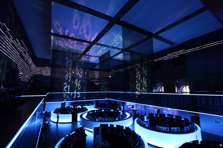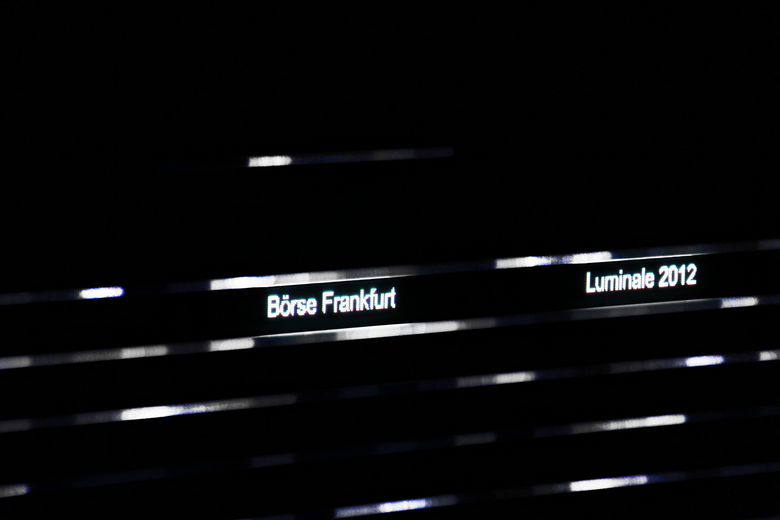 Zum Auftakt des Lichtkunstfestivals Luminale 2012 präsentiert die Börse Frankfurt die „Blaue Nacht“. Der große Handelssaal verwandelt sich in eine künstlerische Installation, die das Thema „Technik und Mensch“ reflektiert. Eine subtile Licht- und Klangchoreographie macht den führenden deutschen Handelsplatz für Wertpapiere auf neue Weise erlebbar. Die Handelsschranken – Arbeitsplatz von über 50 Spezialisten – erscheinen in mystisches Blau getaucht; die DAX-Linie und einzelne Werte der Kursanzeige beginnen frei im Raum zu schweben. Sie durchdringen – projiziert auf feine Gaze – den Raum und überlagern die saalumgreifende Weltkarte, eine permanente Lichtinstallation. Deren pulsierende Lichtlinien stehen für technische Impulse und die Geschwindigkeit der Handelsabläufe. Licht und Klang verschmelzen mit dem Raum zu einem immersiven Erlebnis.