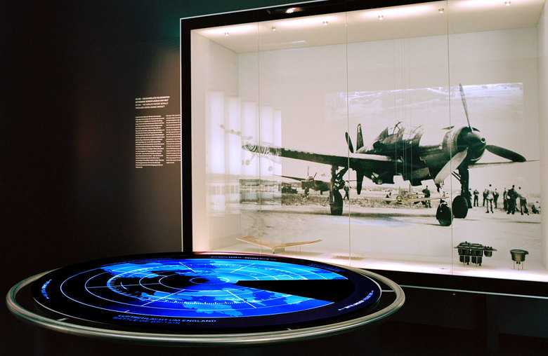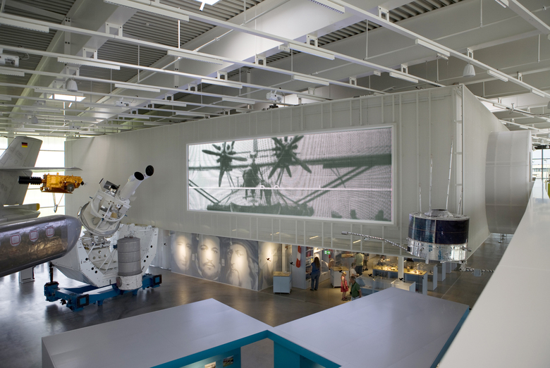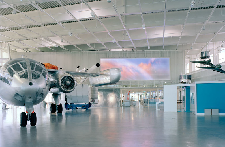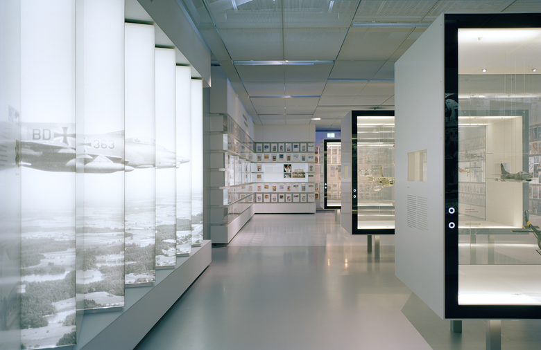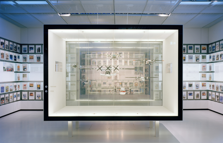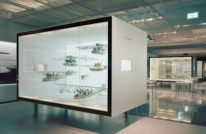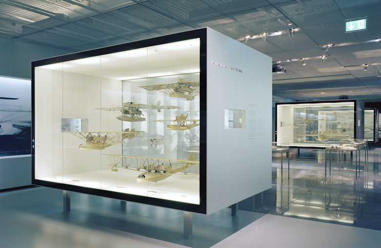 „Where great pioneers meet!“ Unter diesem Motto entführt das neue Dornier Museum in die Welt der Luft- und Raumfahrt. Rund 400 Exponate geben einen Überblick über 100 Jahre Pioniergeist der Firma Dornier. In einem neu errichteten Hangar, angebunden an den Flughafen Friedrichshafen, hat ein gutes Dutzend originaler Dornier-Maschinen ein authentisches Umfeld gefunden. Kleinere Exponate sind in thematisch gruppierte, interaktive Ausstellungskuben eingebunden, die farbige Akzente im Raum setzen; eine weiße Museumsbox – scheinbar frei im Hangar schwebend– ist chronologisch strukturiert. Sie zeigt Exponate in ihrem historischen Kontext und bildet den Kern der inszenierten Ausstellung.