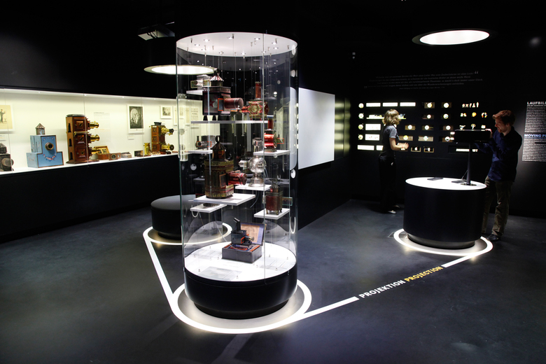 Im ersten Obergeschoss geht es um das „Filmische Sehen“. Dem Besucher wird eine Reise durch ein kaleidoskopartiges Raumbild geboten, das den frühen technischen Entdeckungen und Erfindungen gewidmet ist. Die Gestaltungssprache der akzentuierten, raumbildprägenden Vitrinen erinnert an Filmtrommel und Filmband.