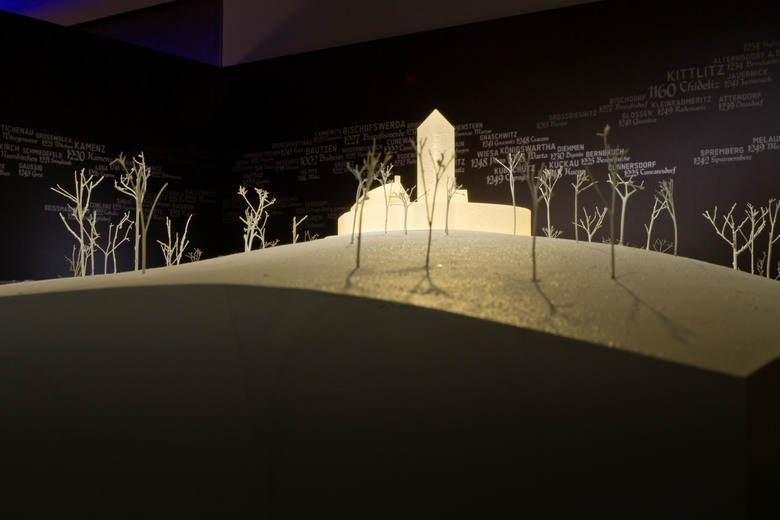Die beiden Hauptinszenierungen des Museums fassen die Ausstellungsbereiche zusammen. So repräsentiert das zeitdynamische Sachsenmodell, angelegt als schwebendes Landschaftsmodell im Maßstab 1:35 000, das Land Sachsen im Zentrum des Gebäudes. Einzelne Landesteile bewegen sich vertikal zwischen den Etagen auf und ab. Bespielt mit medial aufbereiteten Daten zu kulturellen, politischen oder infrastrukturellen Aspekten, stehen sie im visuellen Kontext zu den jeweiligen Themen der Ausstellungsebenen. Ergänzend bietet der 21 Meter hohe geologische Profilschnitt im Aufgangsbereich des Museums einen überraschenden Einstieg in die Erdzeitalter und die Kulturgeschichte.