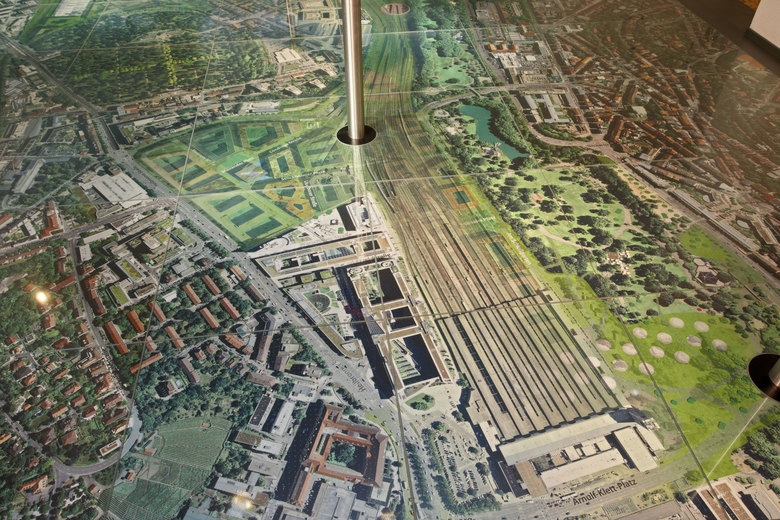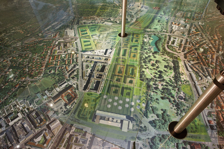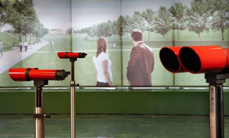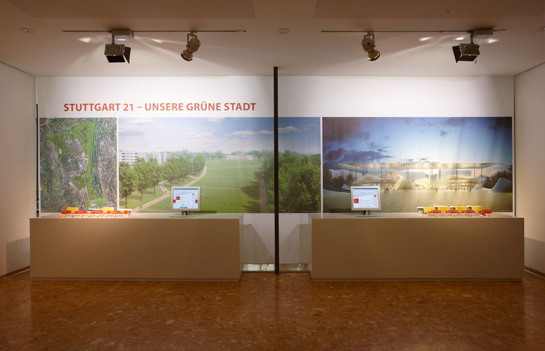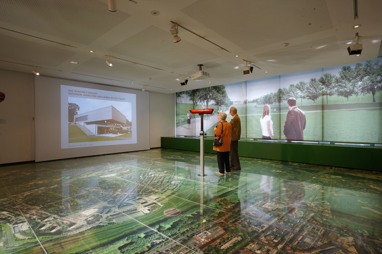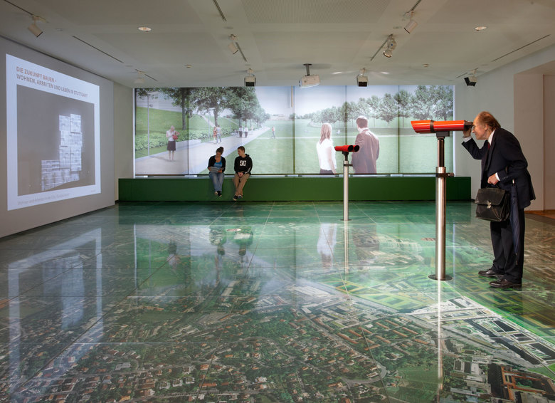 Zukunft sehen: Die städtebauliche Dauerausstellung »Stuttgart 21 – Unsere Grüne Stadt« macht neugierig auf neue Stadtteile im Innenstadtbereich der Landeshauptstadt. Auf 120 Quadratmetern Ausstellungsfläche entfaltet sich eine begehbare Karte, die mit jedem Schritt ihr Erscheinungsbild ändert. Mittels Lentikularfolie verwandeln sich heutige Gleisflächen in grüne Stadtlandschaften. Digitale Fernrohre erlauben gezielte Ein- und Ausblicke auf aktuelle und zukünftige Bauprojekte.