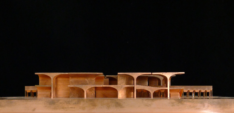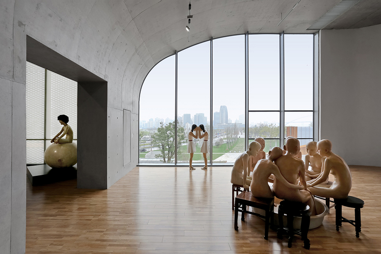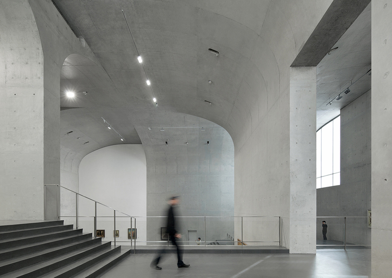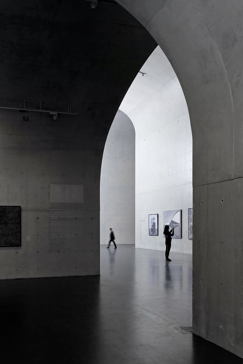 The flowing exhibition space under the overground as-cast-finish concrete “vault-umbrella” and the “white box” exhibition space on the first underground floor are connected with spiral ladders downward. The parallel tensility highlighting the space, primordial but realistic, and the art exhibition from the ancient, modern and contemporary periods, has displayed an exhibition space featuring the temporality.