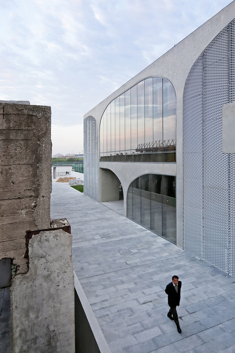 The new design adopts the cantilever structure featuring “vault-umbrella” with independent walls while the shear walls with free layout are embedded into the original basement so as to be concreted with the original framework structure. With the shear walls, the first underground floor of the original parking has been transformed to an exhibition space with the overground space highlighting multiple orientations because of the relative connection of the “vault-umbrella” at different directions; besides, the electrical & mechanical system has been integrated in the “vault-umbrella” structure. As to the overground space covered by the “vault-umbrella”, the walls and the ceiling feature as-cast-finish concrete surface so that their geometrical dividing line seems faint. Such structure cannot only shield the human body in conformation but visually echoes with the Coal-Hopper-Unloading-Bridge at the wharf. Moreover, the building’s internal space can also represent a kind of primordial and tameless charm while the spatial dimension, large or small, and the as-cast-finish concrete surface with the seam among moulding boards and the bolt holes bring a sense of reality as well. The directness and simplicity resulting from this “literal” structure, material and space plus the sense of force or lightness because of large-scale overhanging style enables the overall building’s continuation of the industrial property of the original site, not only in time but in space.
