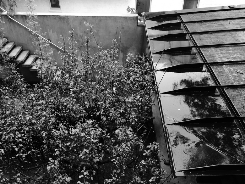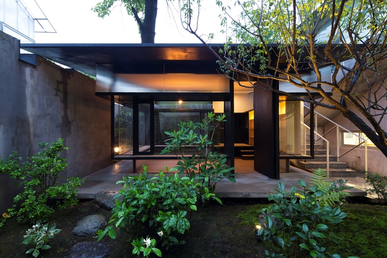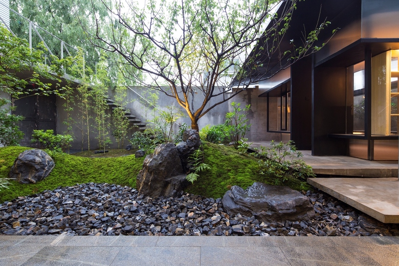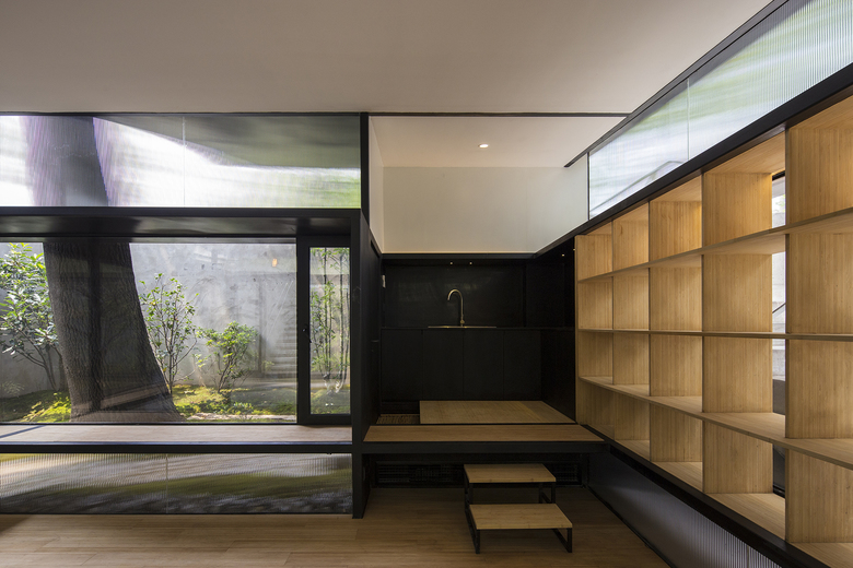 Our design for the Exception Clothing is a teahouse in a small courtyard (around 100 square meters) where a tall paulownia grows. The courtyard, enclosed by walls on its north and west side, has a small corridor and a staircase leading to the adjacent office building on the east and south. Due to the small size of the courtyard, our priority was to create a teahouse that would occupy the minimum space.