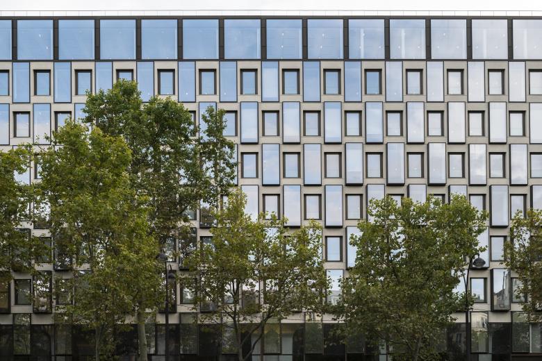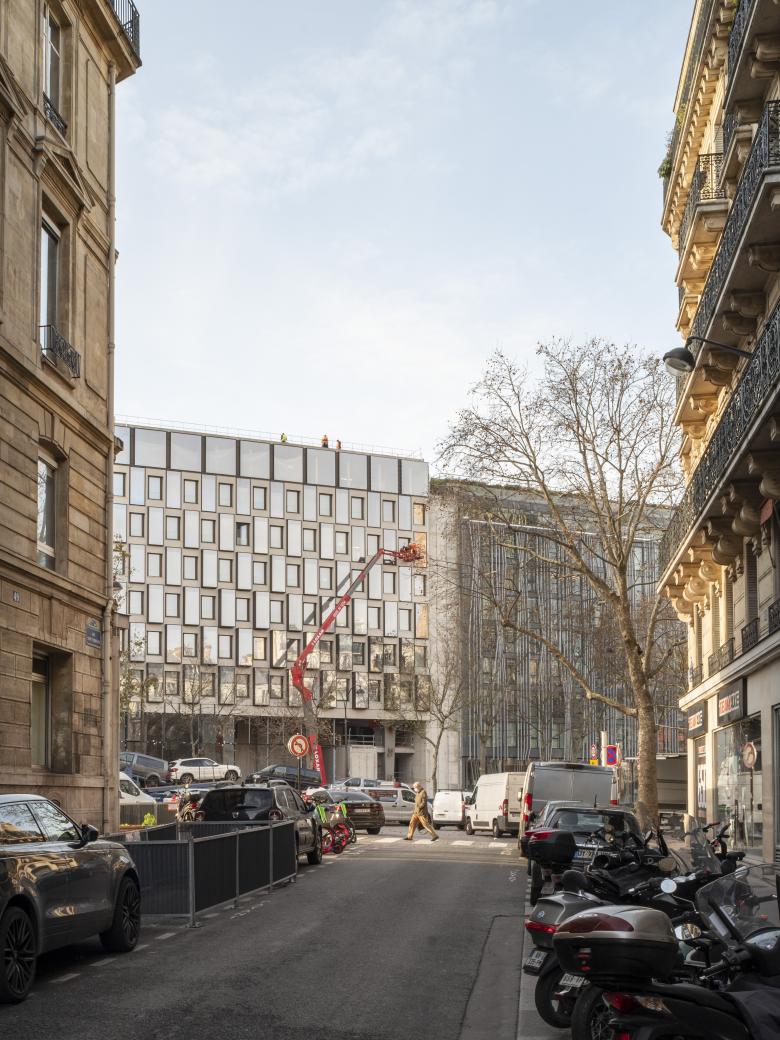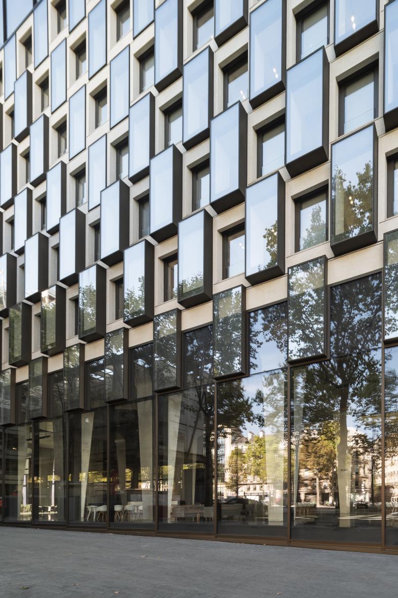Die Fassade an der Avenue wird auf heutige Baustandards gebracht, ihre Struktur bleibt erhalten. Auskragende Fenster-Kästen aus Bronze verstärken thermisch wie ästhetisch die bestehenden Fensteröffnungen. Die Kästen verfügen über unterschiedliche Tiefen, sodass sich ein neuer Rhythmus ergibt. Elementaren Momente der Architektur werden auf diese Weise umgesetzt: Plastizität und selbst gewählte Ordnung finden sich zu einer Fassade, welche der Adresse und dem Projekt „75, Avenue de la Grande Armée“ eine starke Physiognomie verleiht.