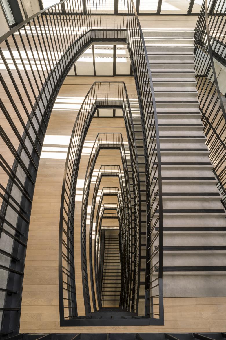 Parterre und Teile des ersten Untergeschosses öffnen das Haus für die Allgemeinheit: Dort finden sich Restaurants, Cafés und ein Auditorium mit 200 Plätzen. Recycling im Detail: Im Fußboden der Galerie mit ihren markanten Betonsäulen und ihrer Kirchenschiffhöhe werden Granitsteine aus der Fassade des Originalgebäudes verarbeitet. Die Mehrzahl der Erschließungskerne wird für den künftigen Bedarf umgestaltet; Panoramalifte und ein monumentales Treppenhaus markieren die Haupterschließung