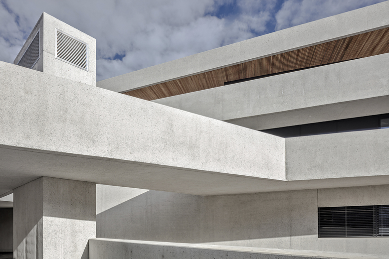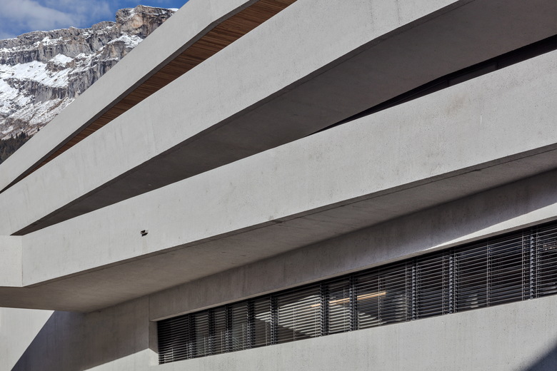 Das Volumen des Brücken-Baus wurde zurückhaltend aus der Situation formuliert. Horizontale „Platten“ erinnern an die alpine Tektonik. Transparenz und Massivität, Abstraktion und Selbstverständlichkeit bilden logische Ergänzungen. Das massive Tragwerk mit Punktstützenraster in Beton sorgt für nachhaltige Entwicklungsfähigkeit, mögliche Änderungen im Gebrauch können schnell und wirtschaftlich effizient umgesetzt werden.