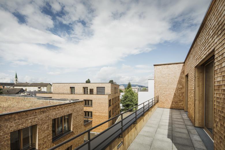 Zwei der insgesamt vier Baukörper bilden ein Entree, leiten von der Straße in die Tiefe des begrünten Areals mit seinem gemeinsamen Platz. Bei der hohen Dichte der Bebauung haben unsere Kolleginnen und Kollegen echte Maßarbeit geleistet. „Raum ist die Beziehung zwischen den Dingen“ hat Adolf Loos einmal geschrieben. In Dornbirn wurde sie Wirklichkeit. Bereichert um ein wichtiges Moment der Wahrnehmung: Die vier Wege zum Platz hin verjüngen oder erweitern sich, Blickperspektiven ändern sich – ein Ort entsteht, Spannung entsteht.