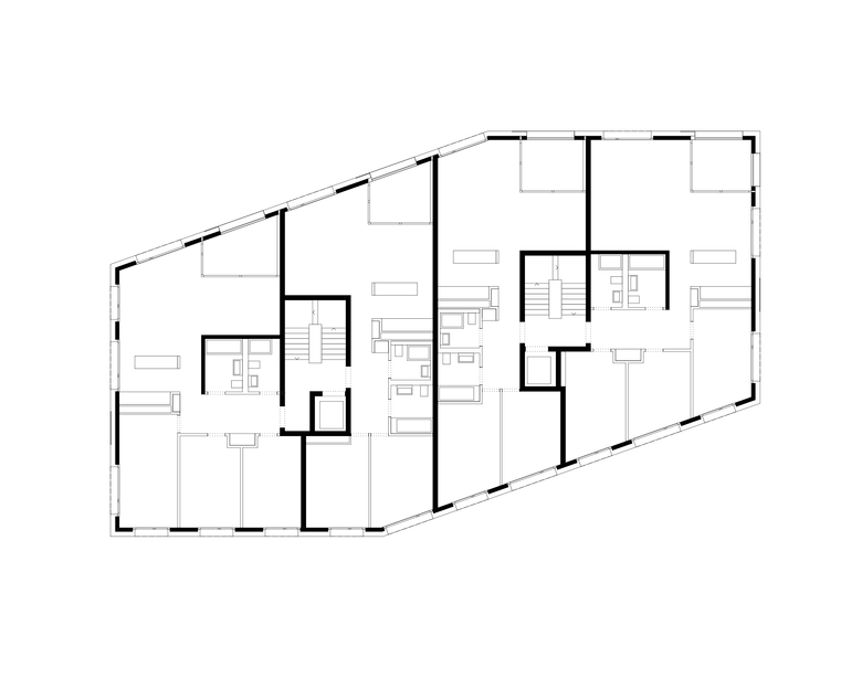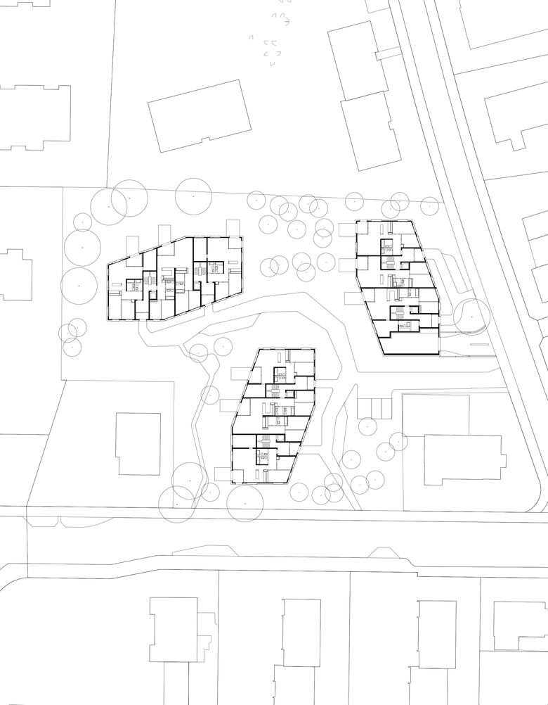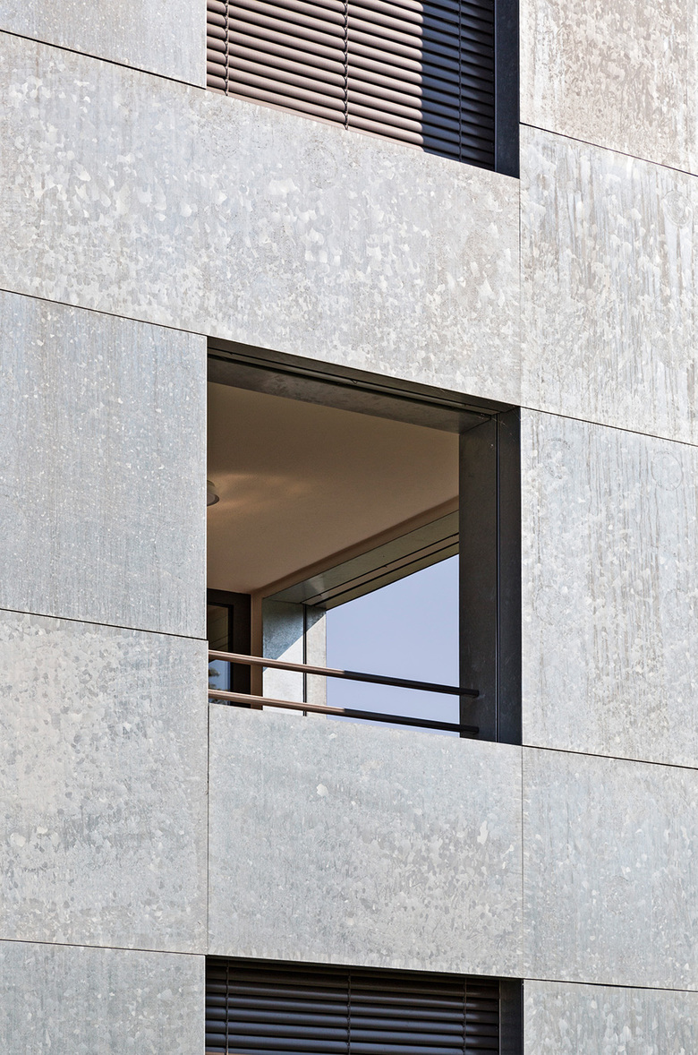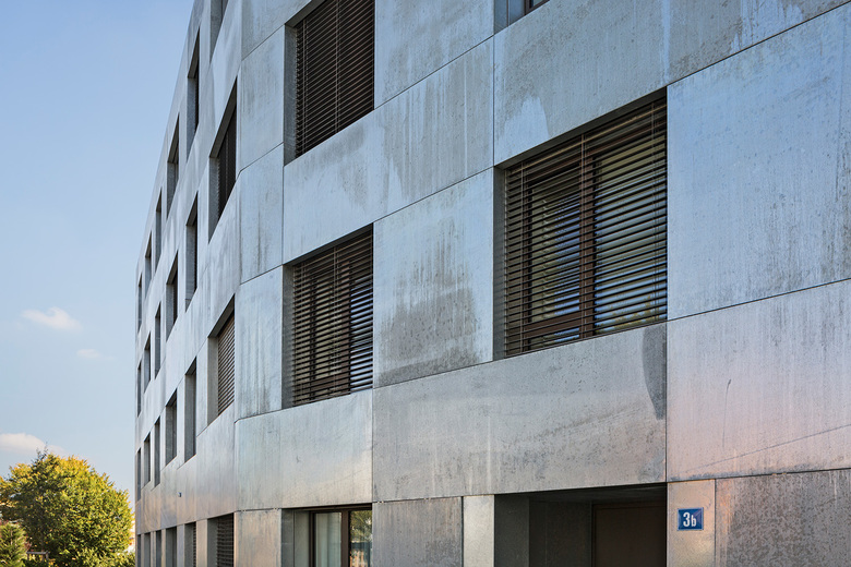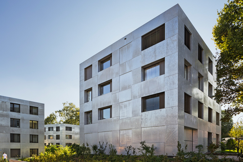Glänzender Auftritt im üppigen Grün – Wie schimmernde Kristalle, eingebettet in üppiges Grün, wirkt die Wohnüberbauung am Chilestieg in Rümlang, Schweiz. Bei der städtebaulichen Planung hat baumschlager eberle sich sensibel an der Bebauung in der Umgebung orientiert. Der sechseckige Zuschnitt der Baukörper und eine Fassade aus feuerverzinktem Stahlblech geben den drei Mehrfamilienhäusern einen markanten Auftritt auf dem Grundstück, das von einem gewachsenen Baumbestand eingefasst ist. Die Häuser sind drei- und viergeschossig und bieten insgesamt 41 Wohnungen.