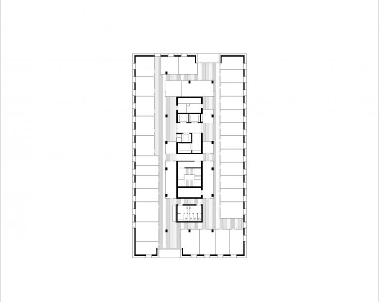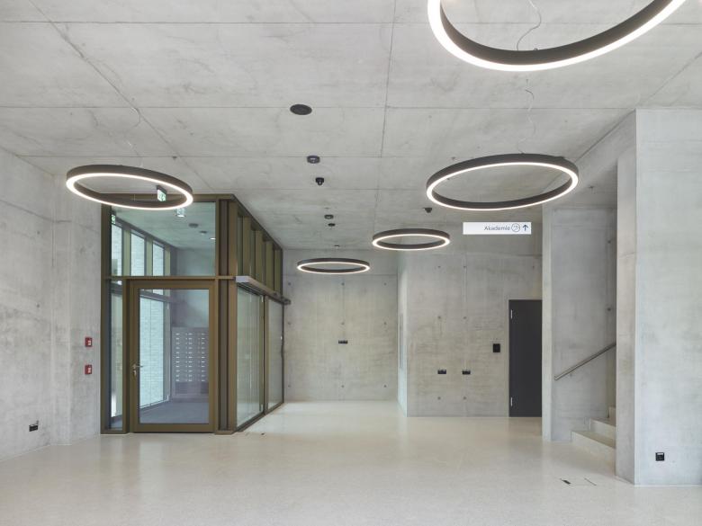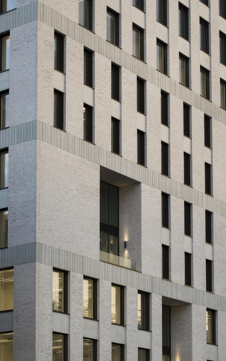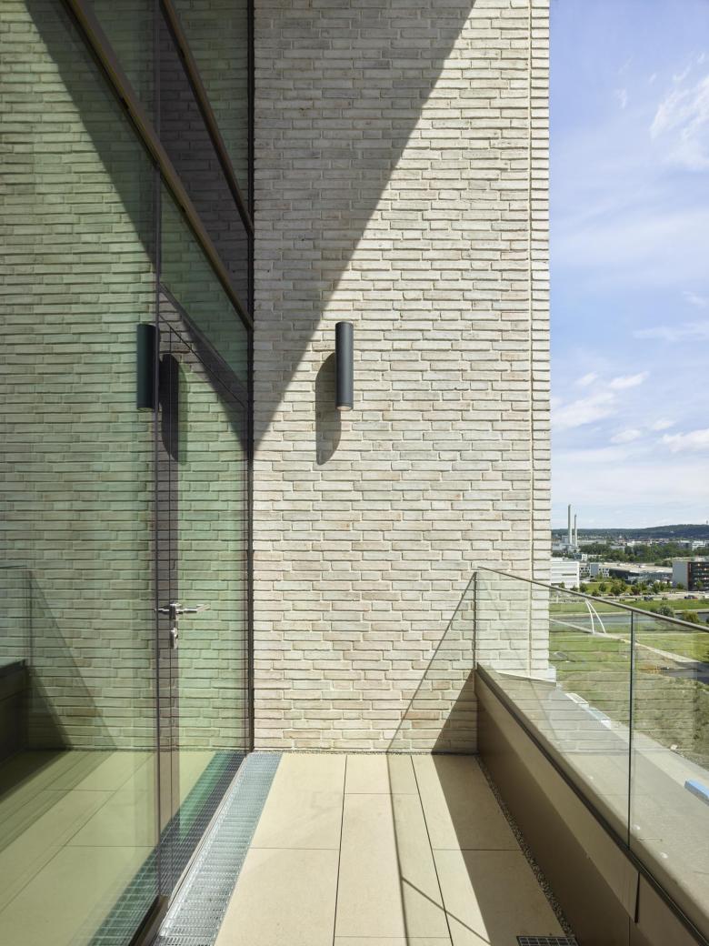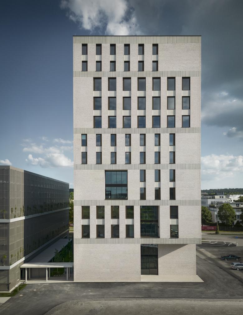 Kurzbeschreibung: Im Rahmen des geplanten Neubaus des Flugfeld-Krankenhauses sollte ein Hochhaus für verschiedene soziale, pädagogische und administrative Nutzungen sowie ein Parkhaus entstehen. Die Realisierung: Ein 13-geschossiger Turm setzt ein markantes Zeichen am Eingang des neuen Campus, dessen Tragwerk eine einfache Stahlbetonschale aus weitgehend recyceltem Beton ist. Große Fensteröffnungen verleihen dem Gebäude eine gehobene Anmutung und sorgen in Verbindung mit dem inneren Kern für eine natürliche Belichtung der Gemeinschaftsbereiche. Merkmale: Der zentrale Erschließungskern und die Fassade sind beide tragend, während die Lochfensterfassade und das einheitliche Rastermuster flexible Grundrisse und kostengünstige Umbauten ermöglichen. Passend zum Kreiskrankenhaus ist der Turm mit einer hellen Klinkerfassade versehen, die durch umlaufende Betonfertigteilbänder horizontal gegliedert ist. Die wechselnden Breiten und Rhythmen der Fensteröffnungen lenken die Aufmerksamkeit auf die größeren Glasflächen, während die Pflastersteine im Außenbereich, die zu 40 % aus recyceltem Beton bestehen, die Nachhaltigkeit des Entwurfs unterstreichen.