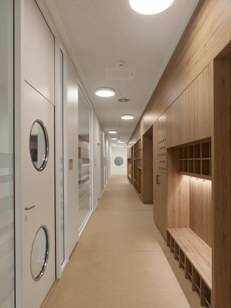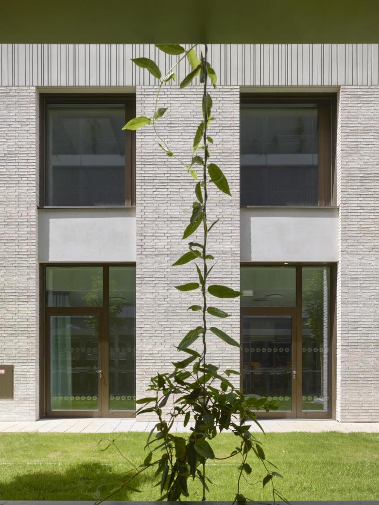 Nachhaltige Bauweise und Außenanlagen. Sowohl der zentrale Erschließungskern als auch die Fassade des Turms sind tragend. Die Lochfensterfassade und das einheitliche Raster bieten eine flexible Nutzung der Geschossflächen und die Möglichkeit, die Innenräume mit relativ geringem Aufwand umzugestalten. Die helle Klinkerfassade, die das Erscheinungsbild des Kreiskrankenhauses ergänzen soll, wird horizontal durch vorgefertigte Betonstreifen gegliedert, die um das Gebäude herum verlaufen. Durch die Verwendung von Lochfensterelementen, die sich über mehrere Geschosse erstrecken, entstehen mehrere getrennte Funktionszonen, die von außen kaum wahrnehmbar sind. Die wechselnden Breiten und Rhythmen der Fensteröffnungen lenken die Aufmerksamkeit auf die größeren Glaselemente, ebenso wie die Bepflanzung den Terrassenbereich vor dem Gebäude aufwertet. Der Außenraum ist mit großformatigen Betonplatten, Grüninseln und bodennahen Wasserbrunnen sowie mit nachhaltigen Pflastersteinen aus 40 % Recyclingbeton ausgestattet. Auch die Pflasterbeläge können aus recycelten Materialien hergestellt werden. Die Pflastersteine lassen sich bei Abnutzung oder Beschädigung leicht austauschen und können am Ende ihrer Nutzungsdauer entfernt und recycelt werden.