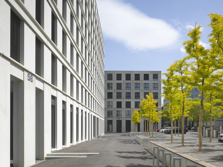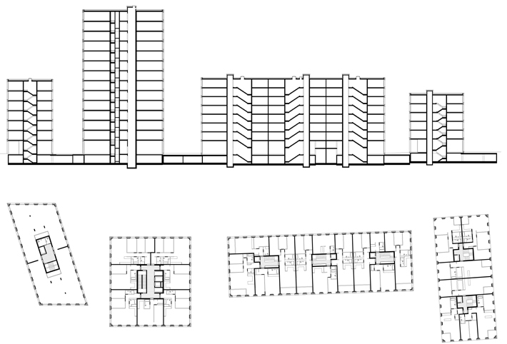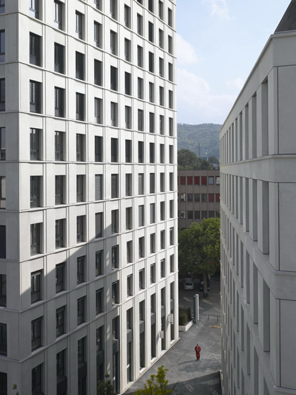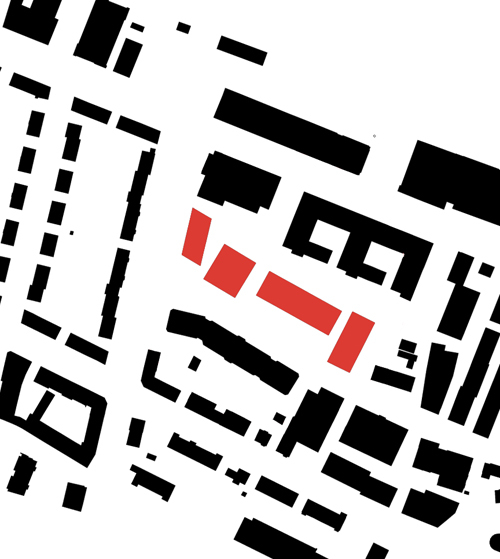 Die Nähe zur City und die ständige Verdichtung geben hier die Möglichkeit, den urbanen Charakter zu verstärken. Das Areal wird durch vier Volumina (Häuser1,2,3,4) besetzt, die trotz unterschiedlicher Formen, mit ihrer gemeinsamen Orthogonale und dem gegenseitigen Bezug von Fluchten eine zusammenhängende Überbauung bilden. Durch ihre Lage, Form und Höhe definieren sie Außen- und Zwischenraumzonen, die alle vier Bauten auf vielfältige Weise miteinander vernetzen. So eröffnet sich eine (amerikanische) vertikale Räumlichkeit zwischen dem Hochhaus und dem ersten Wohnriegel, während etwa der klassisch-europäische point de vue mit dem Querriegel als Abschluss der Gebäudegruppe nach Osten wirksam wird.