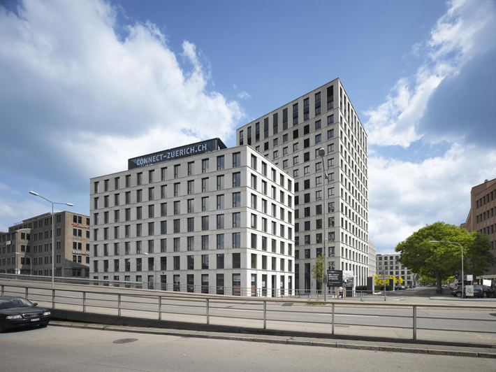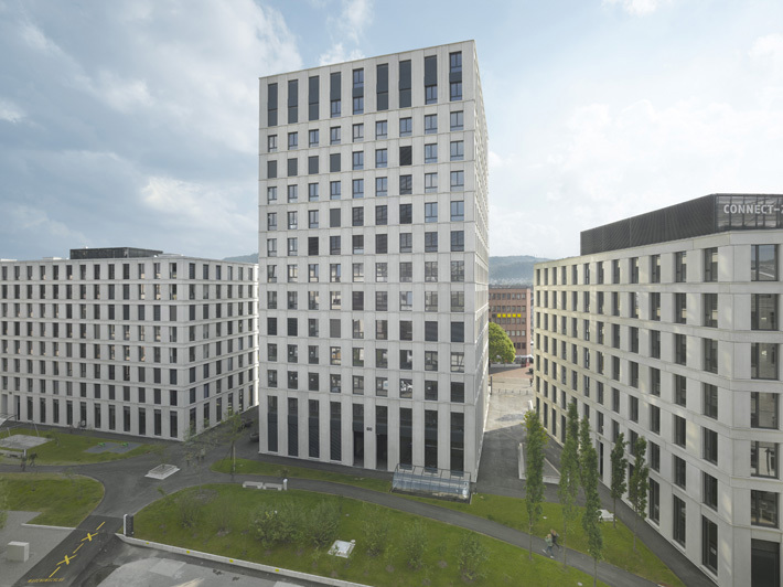 Hohe Dichte, niedrige Werte – Das Projekt erstreckt sich über zwei aneinander grenzende Grundstücke mit unterschiedlichen Besitzern: Die Credit Suisse Anlagestiftung, Zürich und die Migros Pensionskasse MPK. haben sich entschieden, aus städtebaulichen und funktionalen Gründen beide Parzellen gemeinsam zu entwickeln.