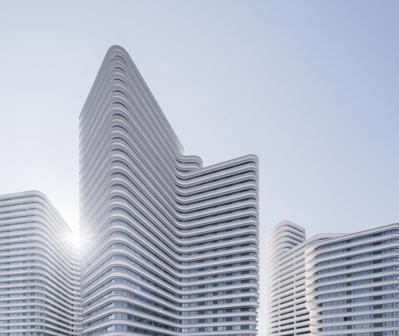Realisation: The creation of a southern-facing aspect was key to the design, for only south-facing units would sell to the demanding Chinese clientele. The monotone, parallel rows of apartment blocks characteristic of China were rejected in favour of powerful, individual buildings. Above ground, the floor area of some 120,000m2 was distributed over three differently shaped tower blocks linked at ground level by a pedestal storey. The arrangement of the towers ensures that at least some of the rooms in each flat are south-facing.