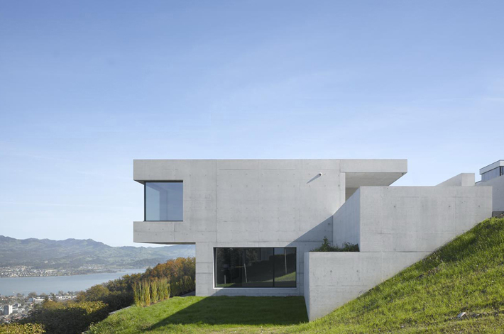 An der Nordfassade wird das architektonische Spiel von Geschlossenheit und Offenheit der Gebäudehülle als etwas Elementares im Bauen verständlich, ohne jedoch Selbstzweck zu werden. Dieser Teil des Hauses ist vorrangig dem Erlebnis unterschiedlichster Blickperspektiven auf den nahen See gewidmet, wobei ganz klar der unterschiedliche Öffentlichkeitscharakter der einzelnen Räume – vom Wohn- bis zum Schlafzimmer – erkennbar ist. An der südlichen Eingangsseite finden sich die privat nutzbaren Freiräume. Besonders spannend ist hier der Übergang zwischen der verkehrsruhigen Erschließungsstraße und dem Areal gelöst: Zwei Wandscheiben – eine ist die umfassende Grundstückmauer, die andere der etwas höhere Sichtschutz für den dahinterliegenden Pool – differenzieren die Annäherung an das eigentliche Gebäude. Und dieses „schaut“ teilweise über den Schichten hinaus, um ein bestimmtes Maß an Nachbarschaft möglich zu machen.