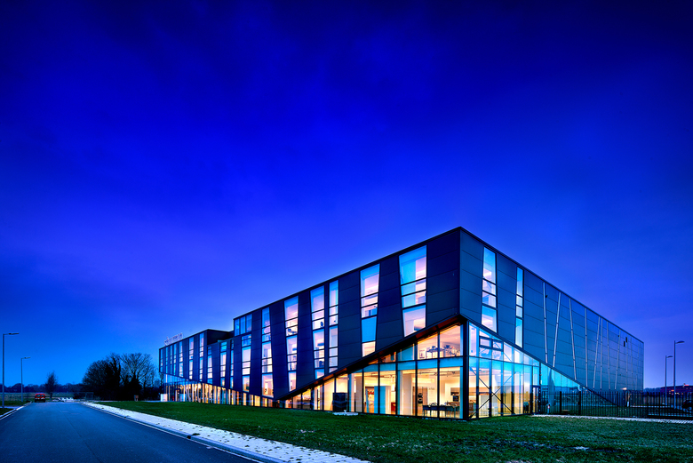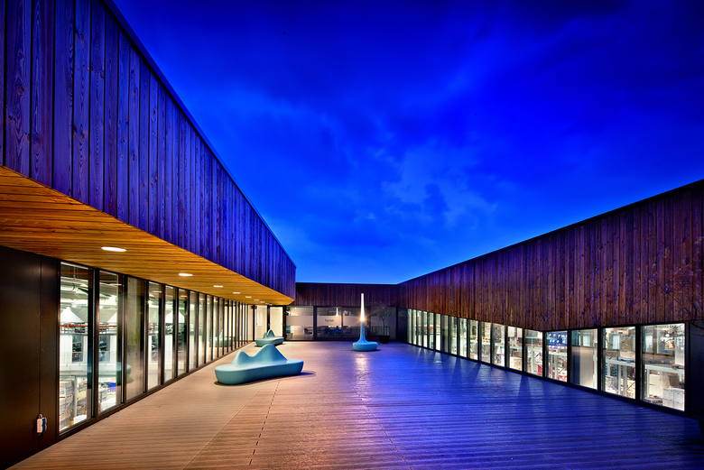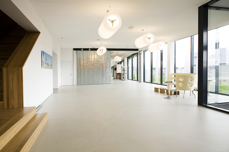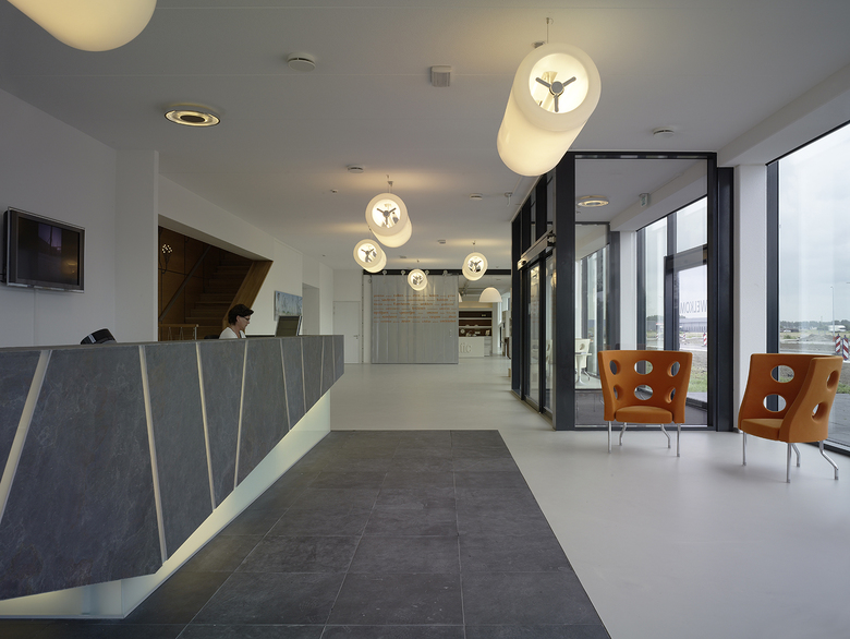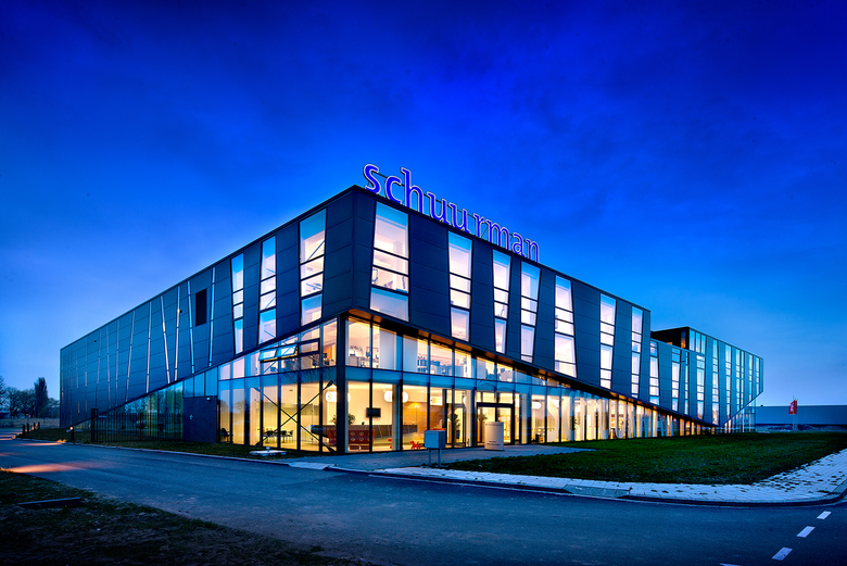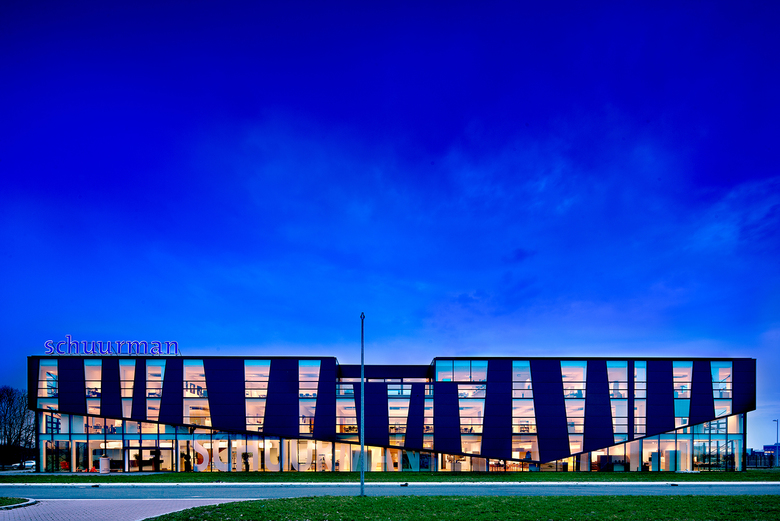 The new accommodation for the Schuurman Group is located on a prime location, seen from the highway A9 in the North of the Netherlands, and adjacent to a nature reserve. It is designed as a freestanding object, whereby each side has its own specific character and appearance. The volume is uplifted at the corners to give room to the special functions of the program.