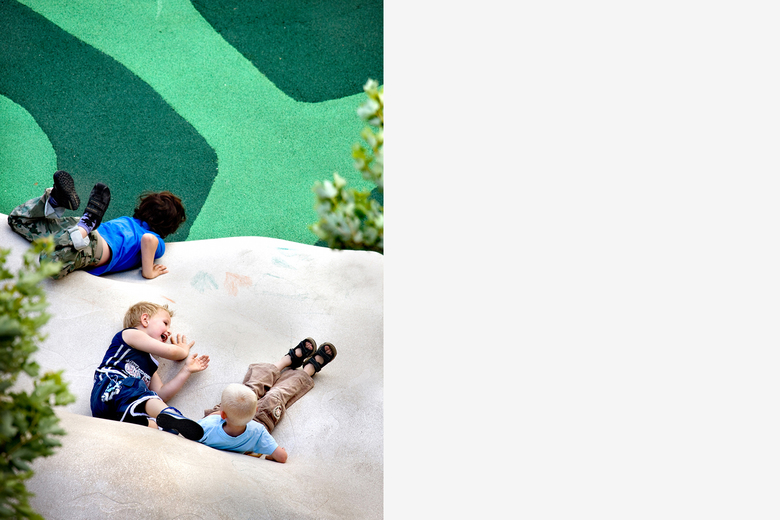 Around the square is a green hedge, which together with the green rubber underground with a pattern of leaves, relates to the theme of ' a secret garden' . This was one of the demands for the projects, set up with the main participants on forehand. More green, shelter and means to play is what the square offers today. The final result challenges children to play in different ways, while adults are invited to use the square as an outdoor accommodation in their neighborhood.