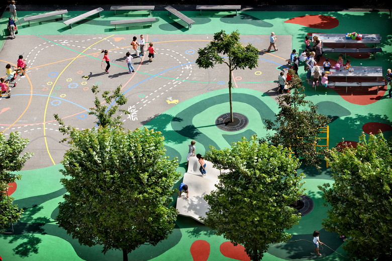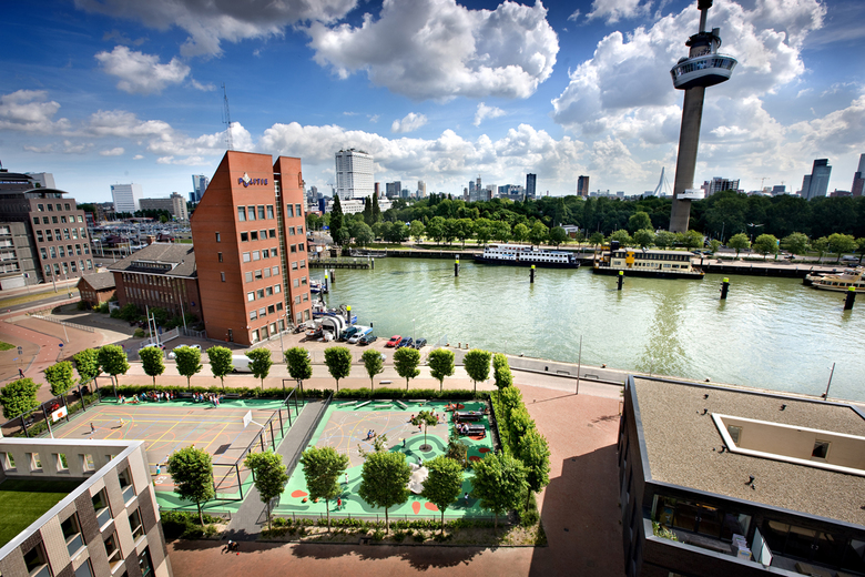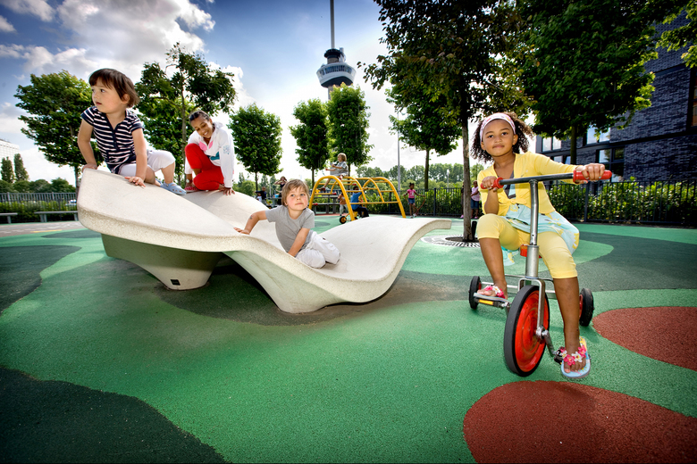 The design for a school, sport and public square is a pilot project, resulting from a research into the potential of playgrounds for the public domain in 2007. The square is located on the Mullerpier in Rotterdam. It is a schoolyard for the primary school nearby, as well a public square. In the vicinity of the square are different functions, such as a home for elderly people, a business centre, a theatre and housing. In the original urban plan the square was q green oases in the neighborhood. The reality was a empty plane of asphalt. Because there was no attraction, it was hardly used by the neighborhood. Also for the school children there was hardly any variety in the means to play.