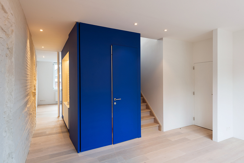 The project consists of two distinct parts, the old and the new. It conserves the original façade on the 1st and 2nd floors, whereby the contemporary intervention, which contrasts with these, serves to highlight them. The modern section is characterised by a lathwork of wooden slats, creating an interplay of light and shadow and giving the building a dynamic singularity when seen in the context of the street view. As regards the spatial organization, in the same logic as the front façade, the dialogue between the old brick walls and the contemporary lattice screens defines the spirit of the place. The surfaces are open, with the space being punctuated by just two boxes. The first of these contains sanitation and technical ducting, while the second is conceived like a building. Both of them seem to float in the void, which is thus perceived as large and generous.