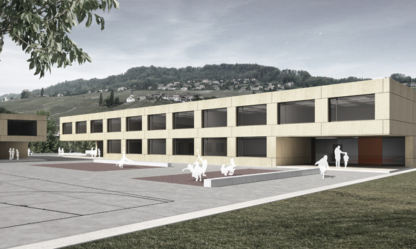 La parcelle située à la limite de la partie basse du village, a proximité d’une zone de villas, permet de créer un élément urbain pour le quartier mais également pour le village : un espace collectif de rencontre. Deux formes urbaines simples, la barre et le plot, génèrent cette place protégée qui devient le préau de l’école et une place publique en dehors des horaires scolaires. La tension manifeste entre les 2 volumes urbains marque l’accès aux bâtiments et défini un parvis public pour l’école. Des évidements pratiques dans ces volumes créent trois préaux couverts, l’un marque l’entrée du bâtiment scolaire, l’autre, celui de la salle de gymnastique. Le troisième, celui de l’UAPE. Une série de murs de faible hauteur (50 cm) génèrent un socle qui rassemble les 2 formes urbaines, le préau ainsi que les installations sportives. Cette légère différence de niveau entre la rue et le préau protège les utilisateurs du trafic routier et renforce son statut exclusivement piéton. Ces murets organisent l’espace public et précisent la limite entre le socle et la rue d’Allaman et lie l’espace public de l’école avec le village. A ce titre, il réinterprète un élément présent dans l’inconscient collectif du village (murs qui délimitent et relient des parcelles vigneronnes aux abords du village de Féchy).