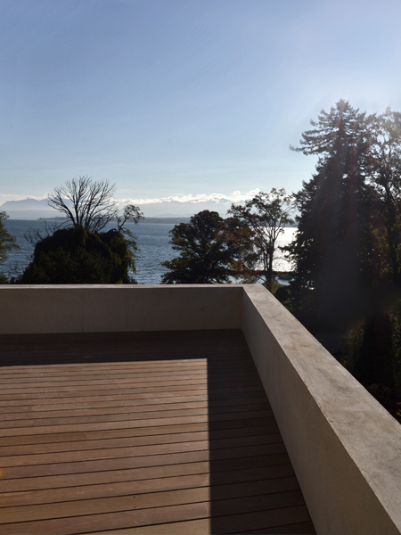La villa existante est implantée comme un pavillon dans un parc au bord du lac Léman en bordure du mur d’enceinte. Il s’agit d’une villa en béton construite à la fin des années 70. Les espaces de vie (préparation/ partage des repas) est en lien avec le jardin au sud et dispose d’une vue sur le parc attenant. A l’étage, sous la toiture, se retrouvent les espaces de repos qui disposent également d’une vue panoramique sur le lac et les alpes.Le projet consiste à mettre en œuvre un volume vitré qui dilate l’espace de la cuisine vers la salle à manger. Un mur de soutènement prolonge les murs existants de la villa de manière à créer un socle horizontal (terrasse) qui souligne le panorama du lac et des alpes.La toiture de l’extension offre un balcon sur le lac aux espaces de repos de l’étage. Les aménagements extérieures clarifient les accès : 1 accès à la villa depuis le portail d’entrée et un cheminement vers la terrasse et le lac en bordure du mur d’enceinte.
