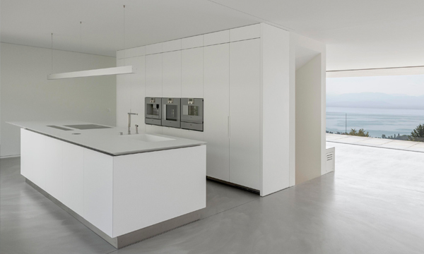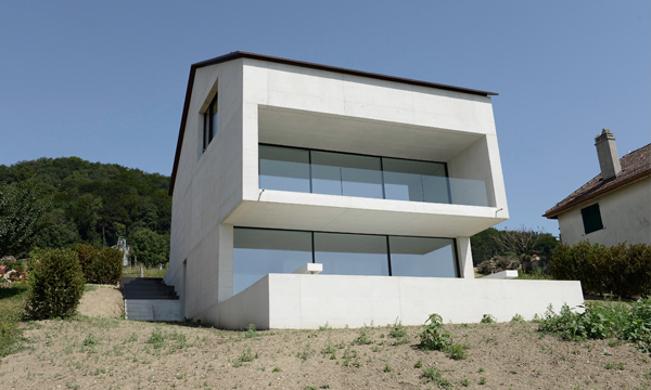 Le village de Mont Sur Rolle se situe entre les villes de Genève et Lausanne sur la rive Nord du Lac Léman. La villa s’implante sur un site en pente marquée entre Alpes et Jura.Un volume simple et massif en béton s’enfoncedans le terrain. Il est creusé a divers endroits afin de faire naître loggia ou terrasses. L'espace de vie (préparation/ partage des repas) est en lien avec le chemin d’accès au nord et se prolonge au sud par une loggia qui cadre la vue sur le lac et les Alpes. Le niveau inférieur (espace pour se réunir et recevoir) se prolonge par une ''terrasse dans le vignoble’''. A l’étage, sous la toiture, se retrouvent les espaces de repos et de méditation. Au sous-sol, s’organisent des espaces utilitaires ainsi qu’un espace de bien être en liaison directe avec la terrasse par l’entremise d’un escalier extérieure qui introduit la lumière naturelle.