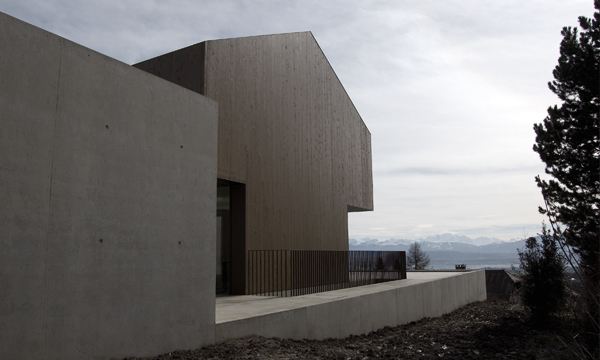Le socle est réalisé en béton teinté beige. Les parties non visibles sont réalisées en béton recyclé. Le volume en bois est constitué de panneaux préfabriqués. Un porte-à-faux en bois de 2.5m x 12m permet de cadrer la vue sur le lac et les montagnes en l’absence de tout obstacle visuel. Le volume protégé de la terrasse ainsi crée, réalise la transition entre l’espace de vie et la terrasse extérieure. Les panneaux sont revêtus d’un bardage en épicéa revêtu d’une lasure légèrement teintée de manière à créer un dialogue ambigu avec les volumes en béton.