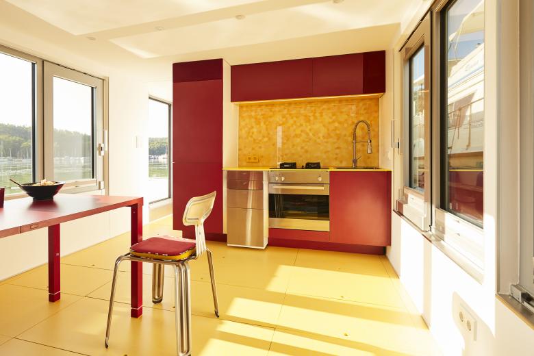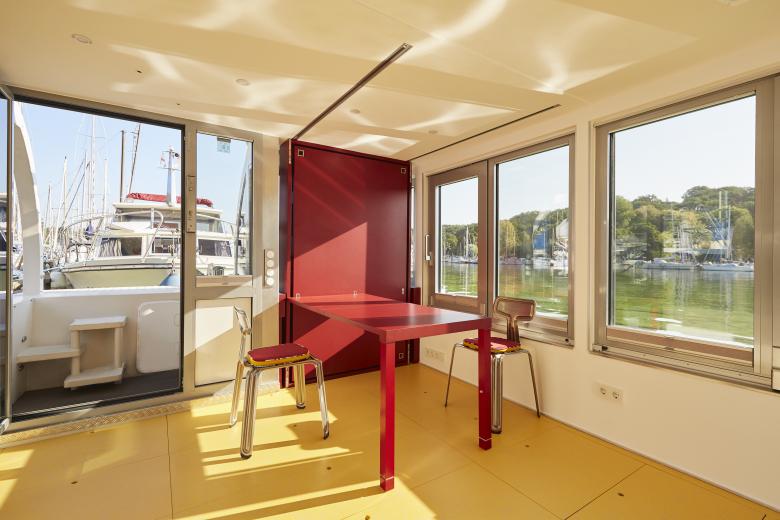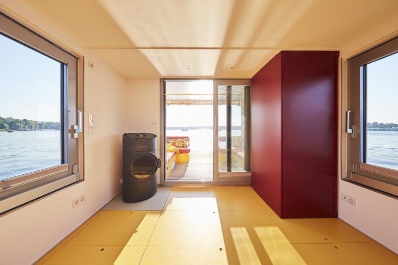 A living machine: technical and sustainable integration – With an overall length of 14,69 m and a maximum width of 4,24 m, the boat includes a set of innovative solutions in terms of solar energy, heating source, water and waste management. Advanced technology and electronic features also make the boat "smart and self-powered." This houseboat model is a future-proof prototype for living on the water. To further optimize the prototype, several characteristics were added with the goal of improving efficiency, sustainability and cost-effectiveness.