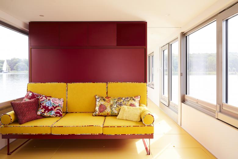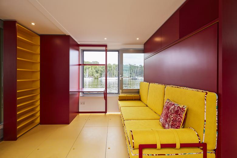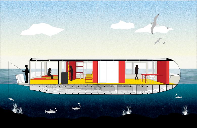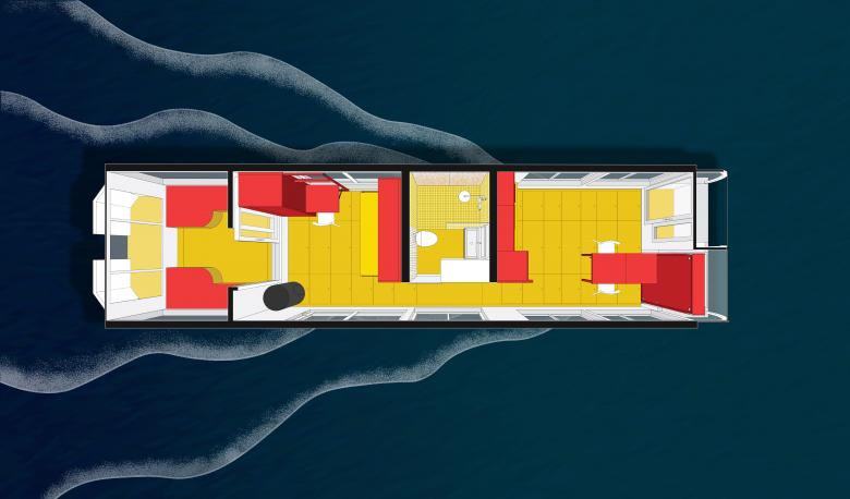 A House that floats. Compact and transformable – While most people in industrialized regions still live in urban areas, the appeal of water in this project is to explore the possibility of adapting to different living conditions while challenging assumed and conventional norms. This compact space is a perfect match for Crossboundaries because it allows for testing flexibility in micro-dwellings where each room assumes multiple programmatic roles. With an overall length of about 15 m and a maximum width of a bit over 4 m, the boat includes a set of interlinked areas, which transform themselves for different scenarios, rather than the user having to move from one room to the other in the traditional sense.
