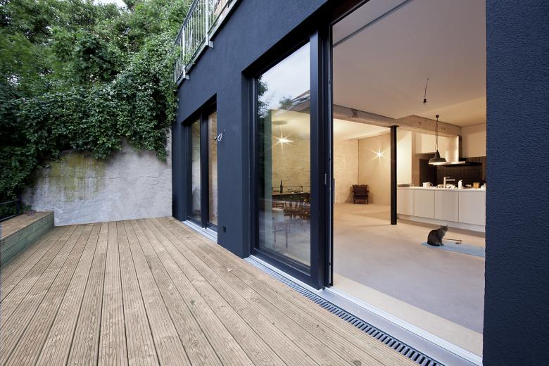 In den Räumlichkeiten eines ehemaligen Handwerksbetriebes mit Wohnnutzung wurde auf zwei Etagen ein offenes, großzügiges Wohndomizil geschaffen. Mit einfachen Materialien und der vorgefundenen Rauheit der Räume wurde eine fliessende Wohnlandschaft kreiert. Eingestellte Wandscheiben und Kuben gliedern die offenen Räume in unterschiedliche Zonen und öffnen sich gezielt zum kleinen, jedoch angemessenen Freibereich.