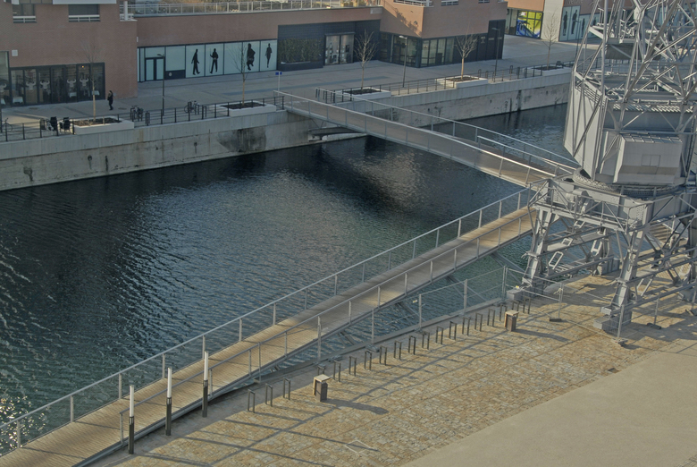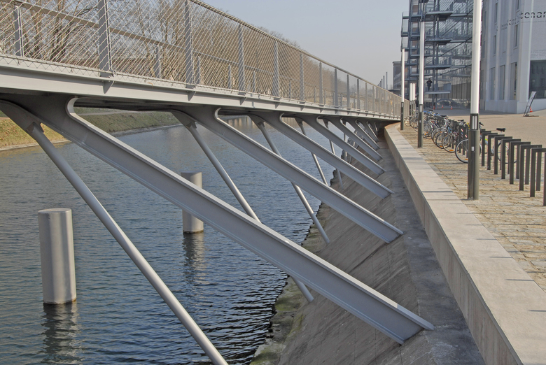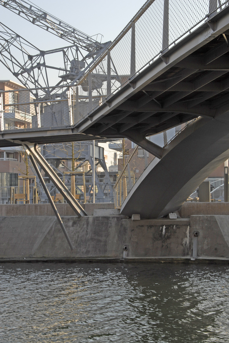 The 3 footbridges are walkways. They continue the urban tissue and link the pier with the city. Besides linking two parts of the city it is the experience of the promenade, the discovering of new perspectives and views, the closeness to the water which guides the design of the bridges. The architectural ambition is to make them part of the urban landscape, integrating them naturally. Lightness and transparency are major issues. The bridges are opposing the dense urban tissue. They contrast the monumentality of the surrounding buildings by their freely adapted geometry. The bridges want to be part of the natural environment, inspired by the presence of water. Like insects they stretch out their members to reach the quay sides offering a multiple choice of crossing – fast and slow, for bicycles and disabled on flat ramps. The ramps are part of the crossing, part of the design.
